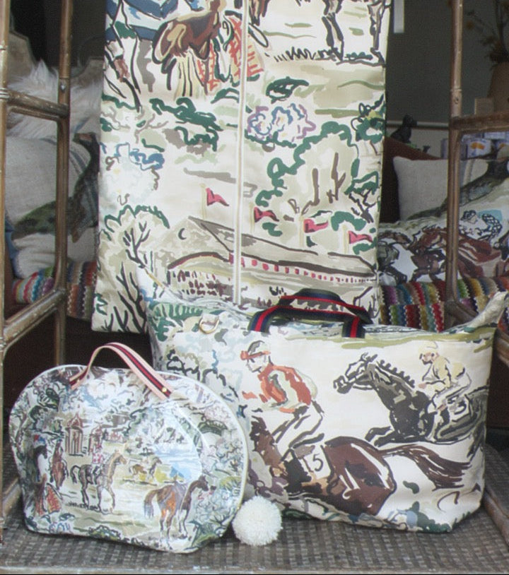 our travel collection brings together three of our most-loved pieces — the no. 5 large cosmetic, gable garment bag, and taylor duffle, all crafted in our signature race day fabric and designed for effortless travel.