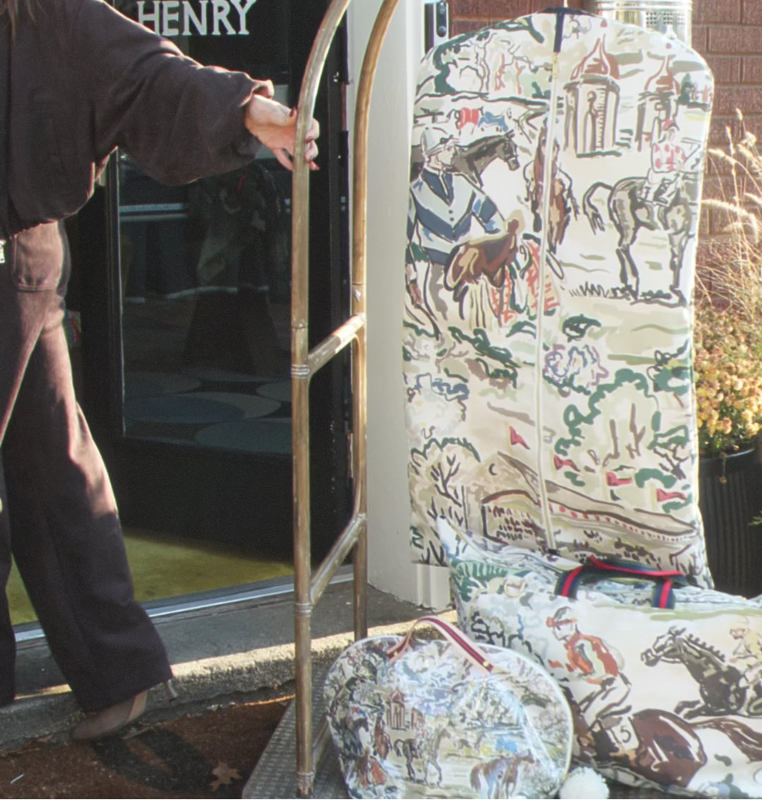our race day travel collection brings together three of our most-loved pieces — the no. 5 large cosmetic, gable garment bag, and taylor duffle, all crafted in our signature race day fabric and designed for effortless travel.