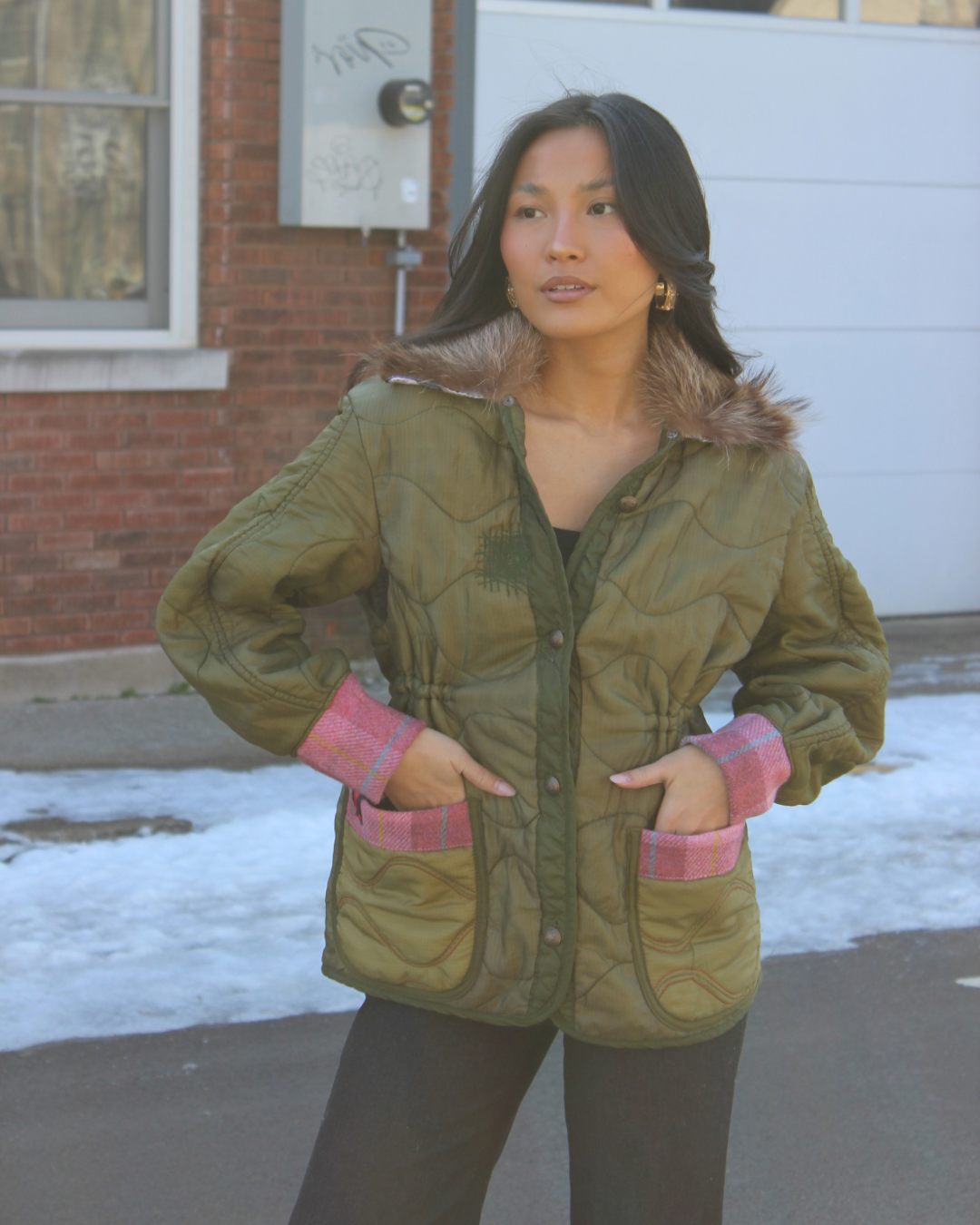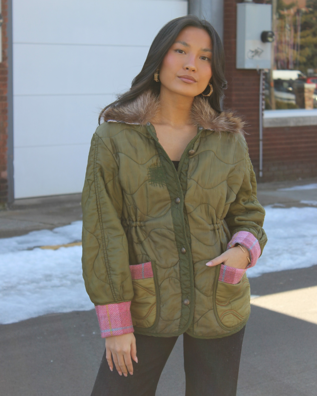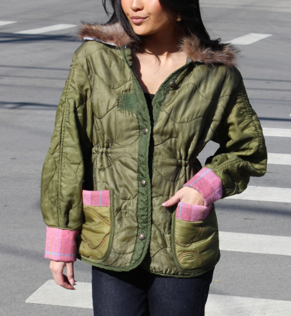 a seasonless staple, our go-to layer, everything you need, and more, in a one-of-a-kind silhouette. this style is made from a vintage military jacket and made better with a fur collar, cinch waist, pink plaid wool, and brass buttons.