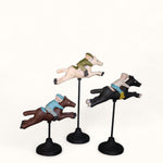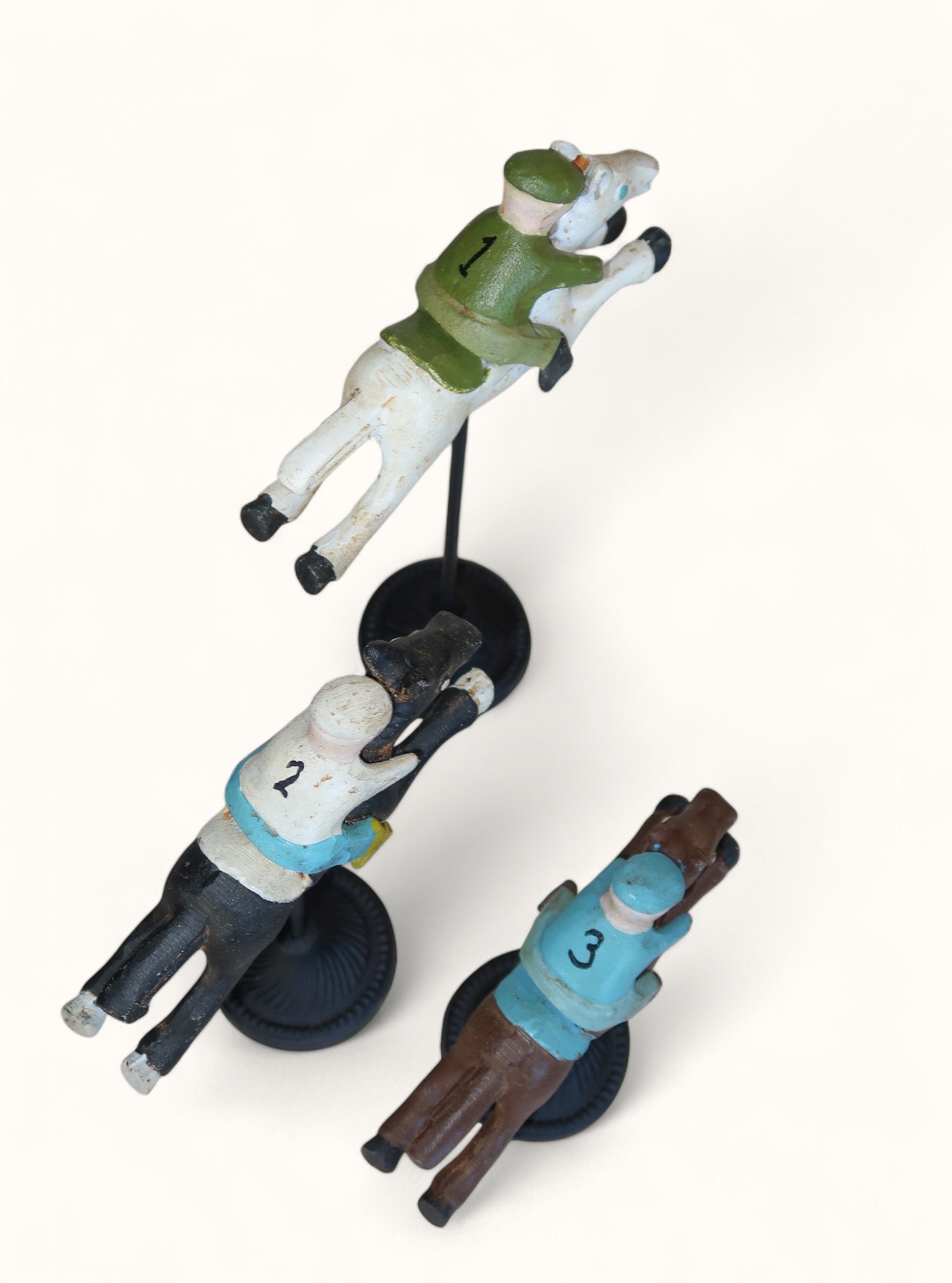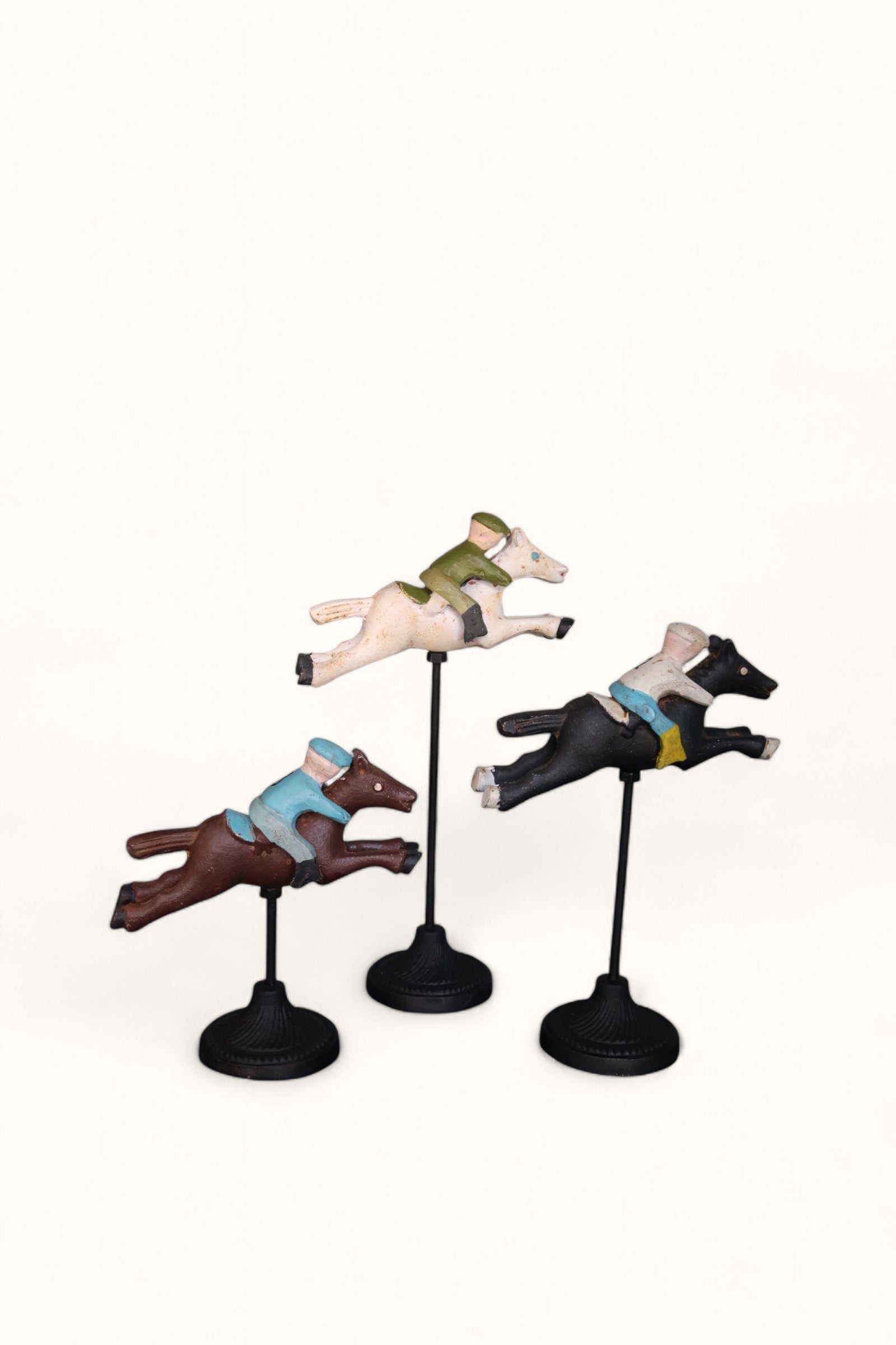 Rev up your decor with this charming set of three horse and jockey figurines. Perfect for year-round display, these mid-stride racers are a true FINE favorite. Take home the win with this quaint addition to your space!