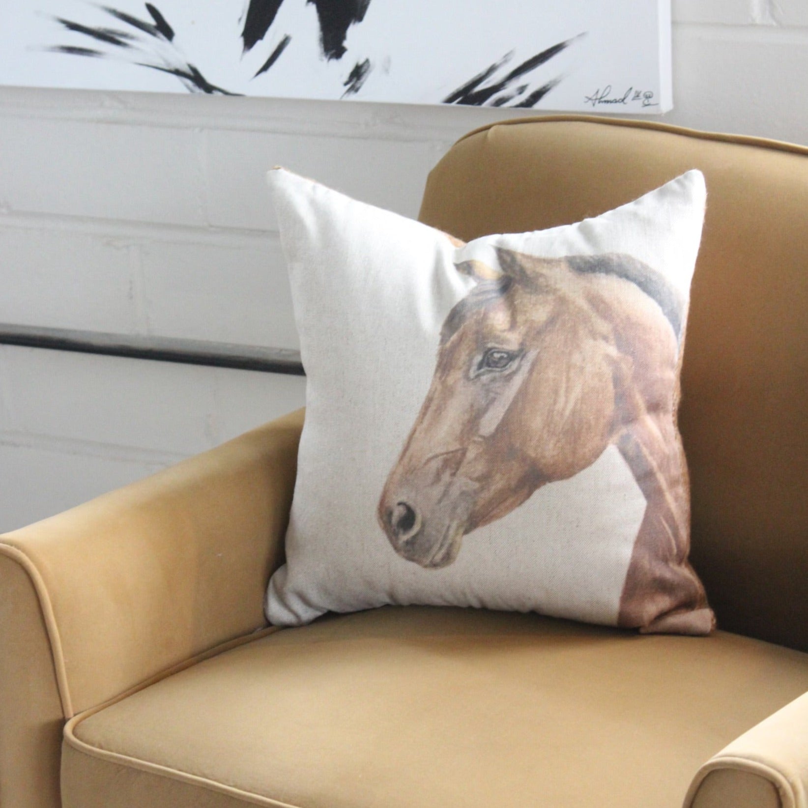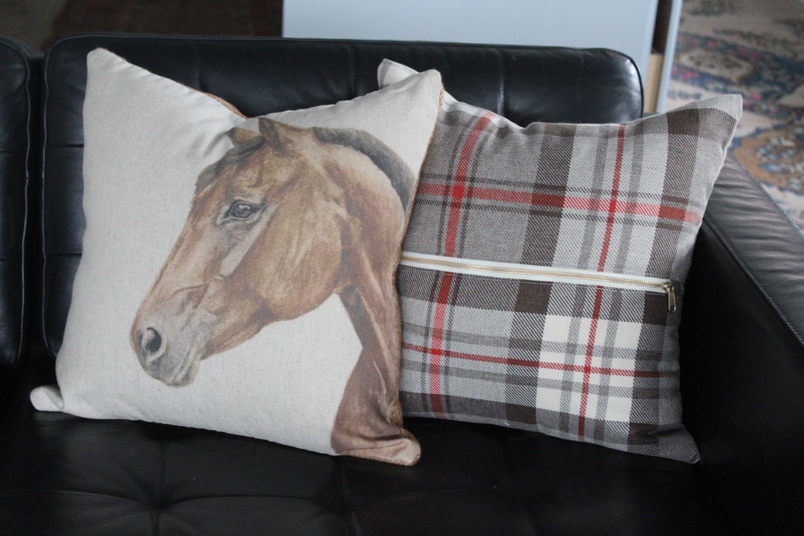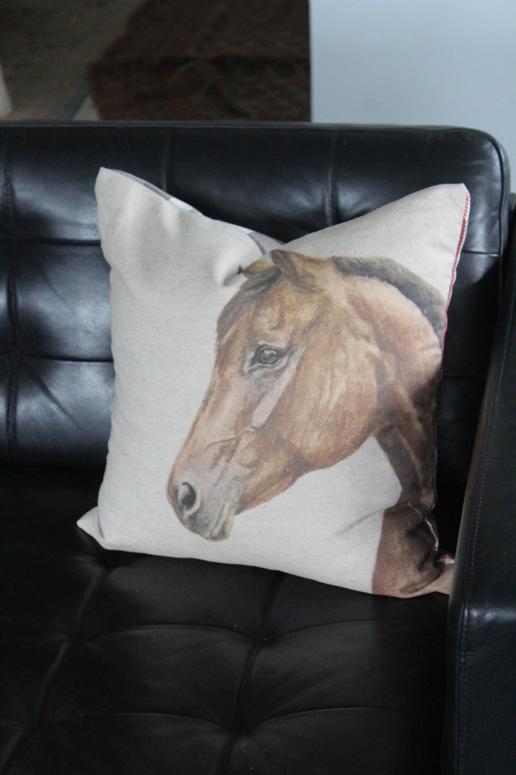 for our seasonal small batch, this silhouette is dressed in its equestrian best featuring a watercolor horse head, painted by our favorite local artist katie, on italian natural linen and an orange or plaid wool back. plush, thanks to a faux-down insert, you'll be sporting this every season!