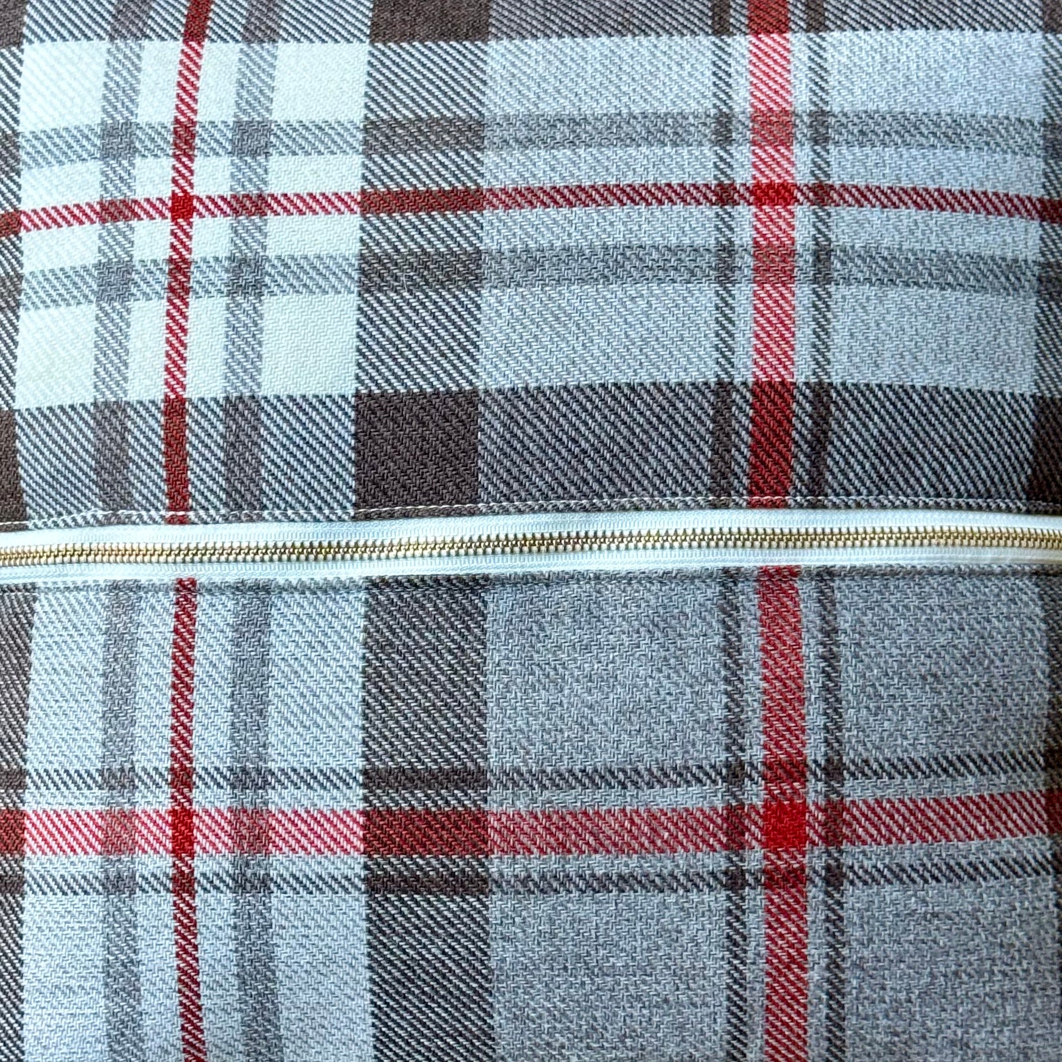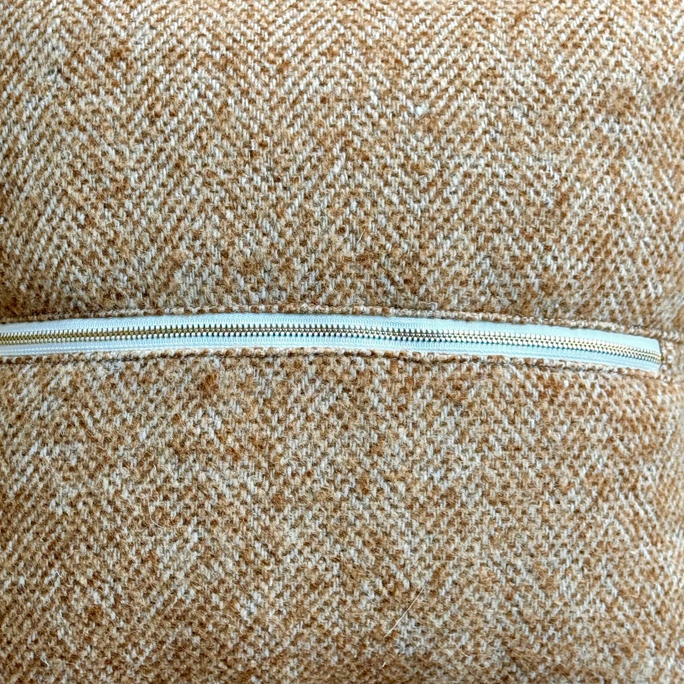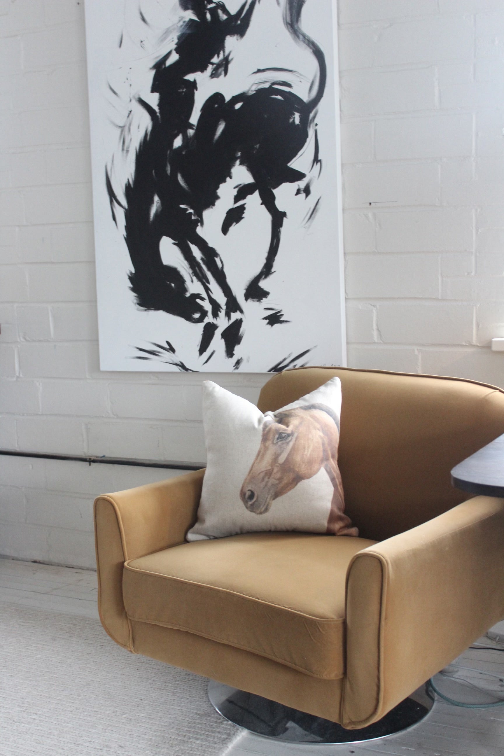 for our seasonal small batch, this silhouette is dressed in its equestrian best featuring a watercolor horse head, painted by our favorite local artist katie, on italian natural linen and an orange or plaid wool back. plush, thanks to a faux-down insert, you'll be sporting this every season!