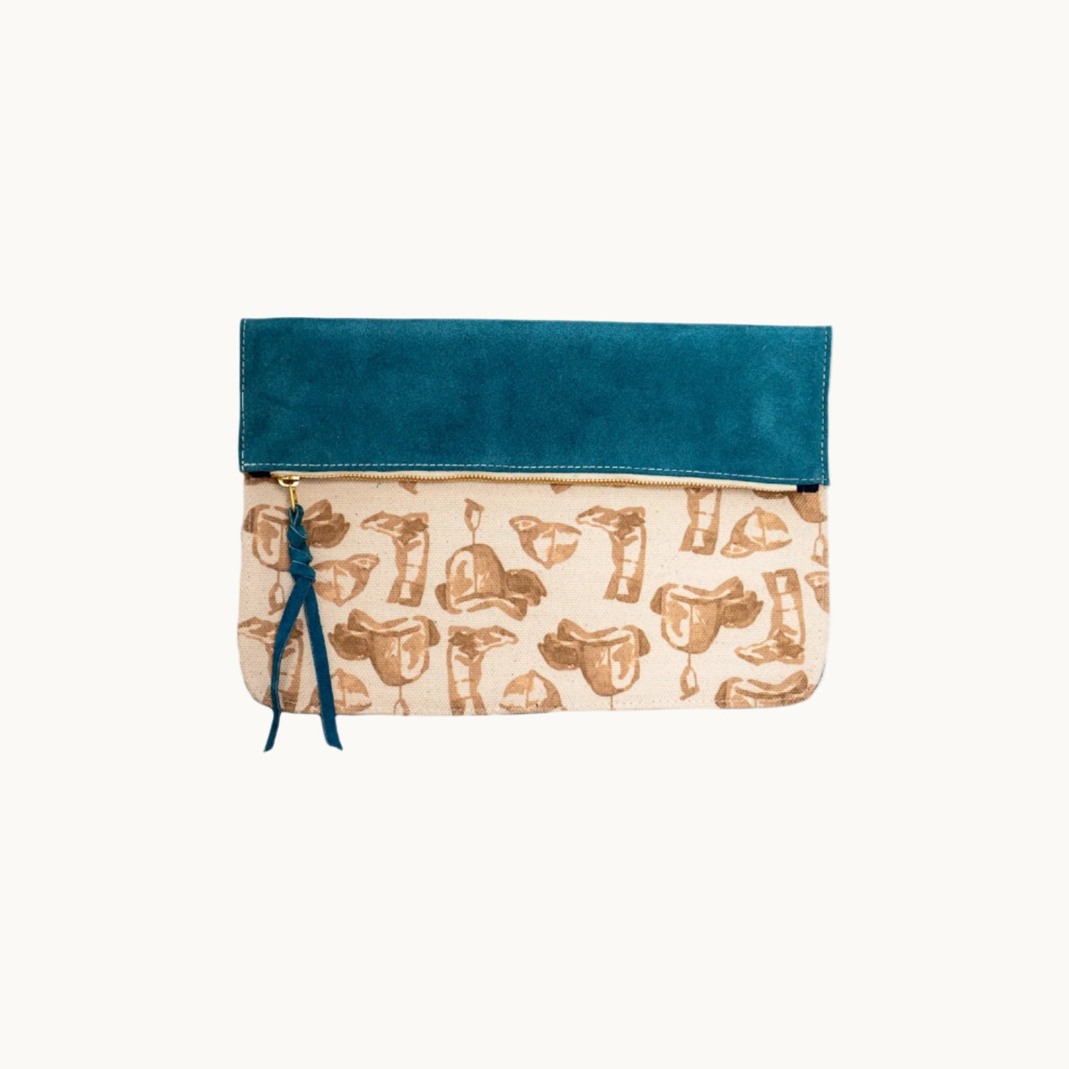 this foldover clutch is ready for the races any day of the week. it features our favorite teal suede on the back, a canvas front with the iconic boots and saddle print, and a teal suede pull.