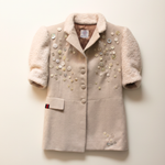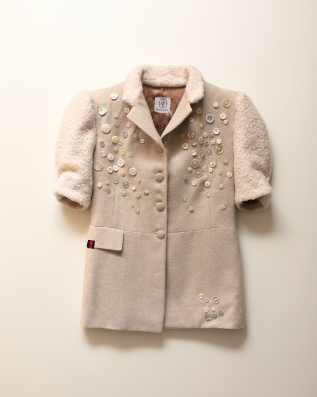 sourced from our vintage room, this one-of-a-kind blazer is thoughtfully reimagined with bouclé puff sleeves and bouclé collar. finished with vintage buttons, adding texture and quiet dimension throughout.