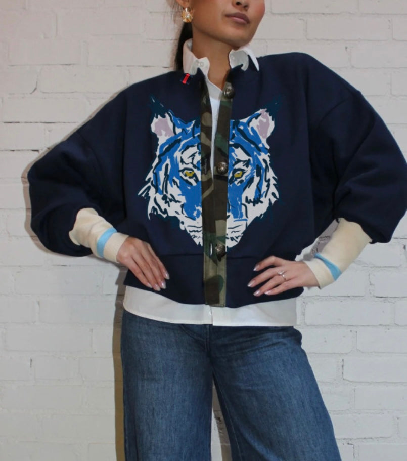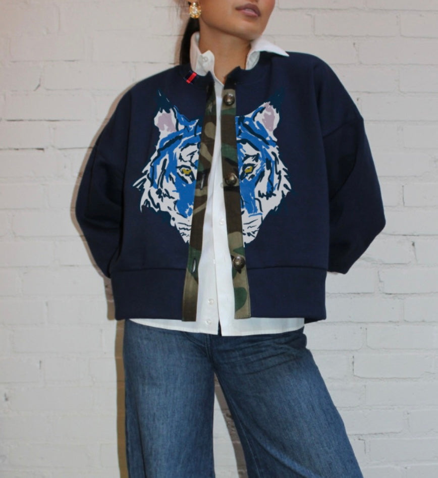 unleash your wild side with this sporty-chic la fauve cardigan. featuring cream with blue-striped cuffs, a camo placket, and classic buttons give it that polished-meets-unexpected feel.