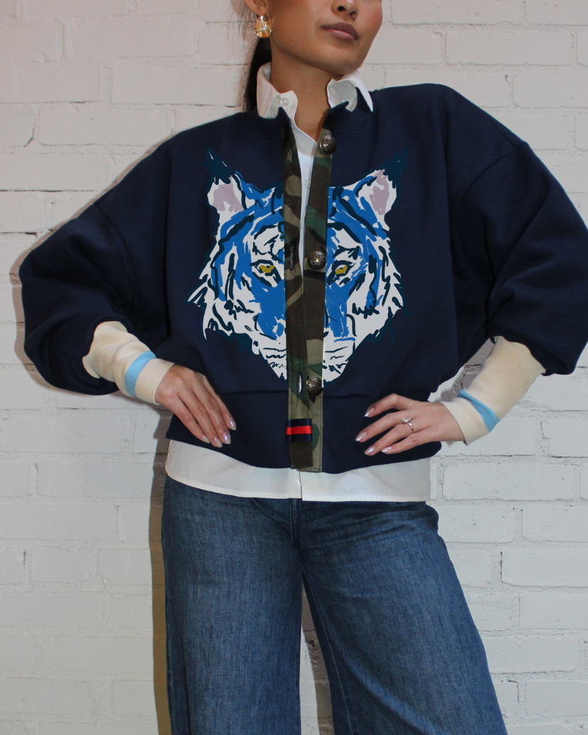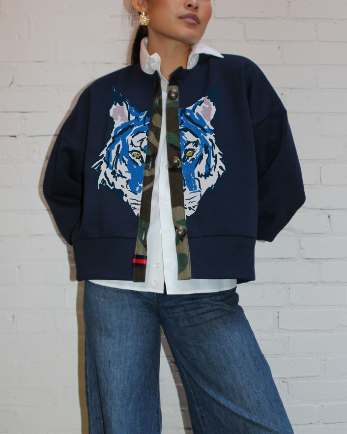 unleash your wild side with this sporty-chic La Fauve cardigan. featuring cream with blue-striped cuffs, a camo placket, and classic buttons give it that polished-meets-unexpected feel.
