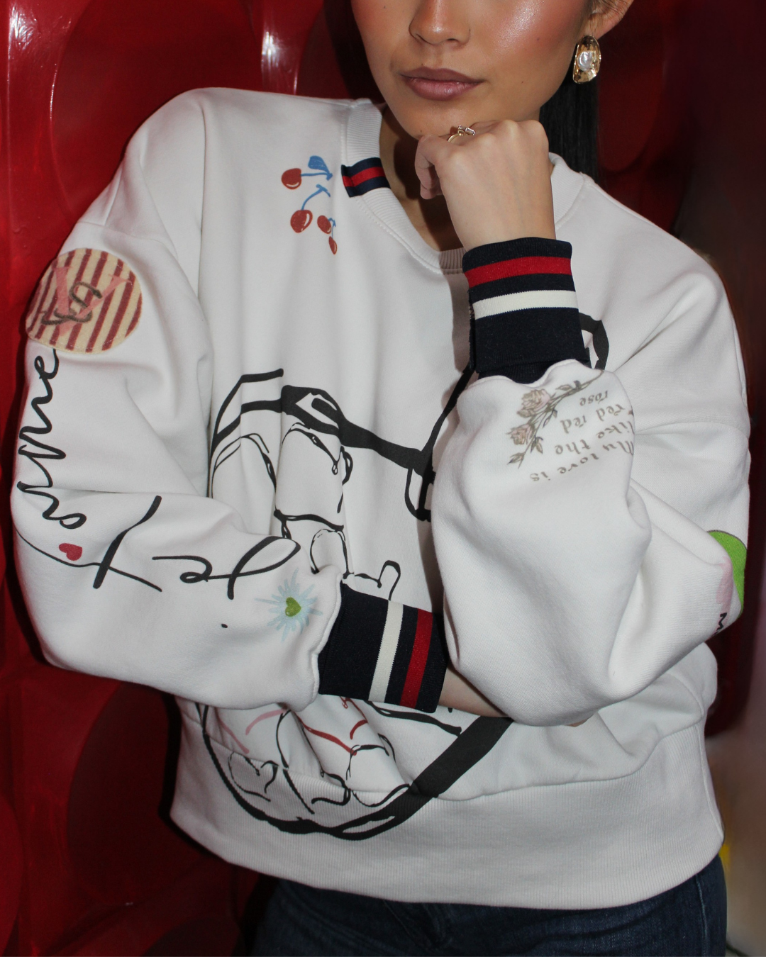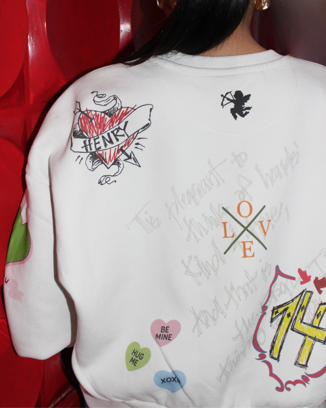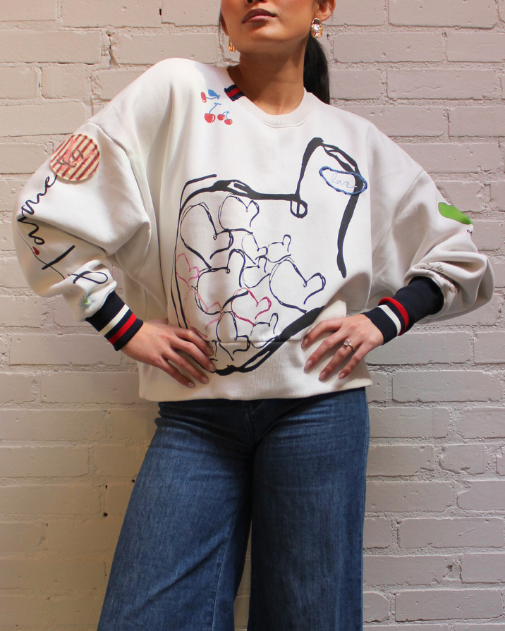 this pullover is a love bomb in sweatshirt form, with hearts, cherries, cupid, and patches stitched throughout. finished with hand-embroidered details and navy cuffs, it’s playful, nostalgic, and made to wear on repeat.