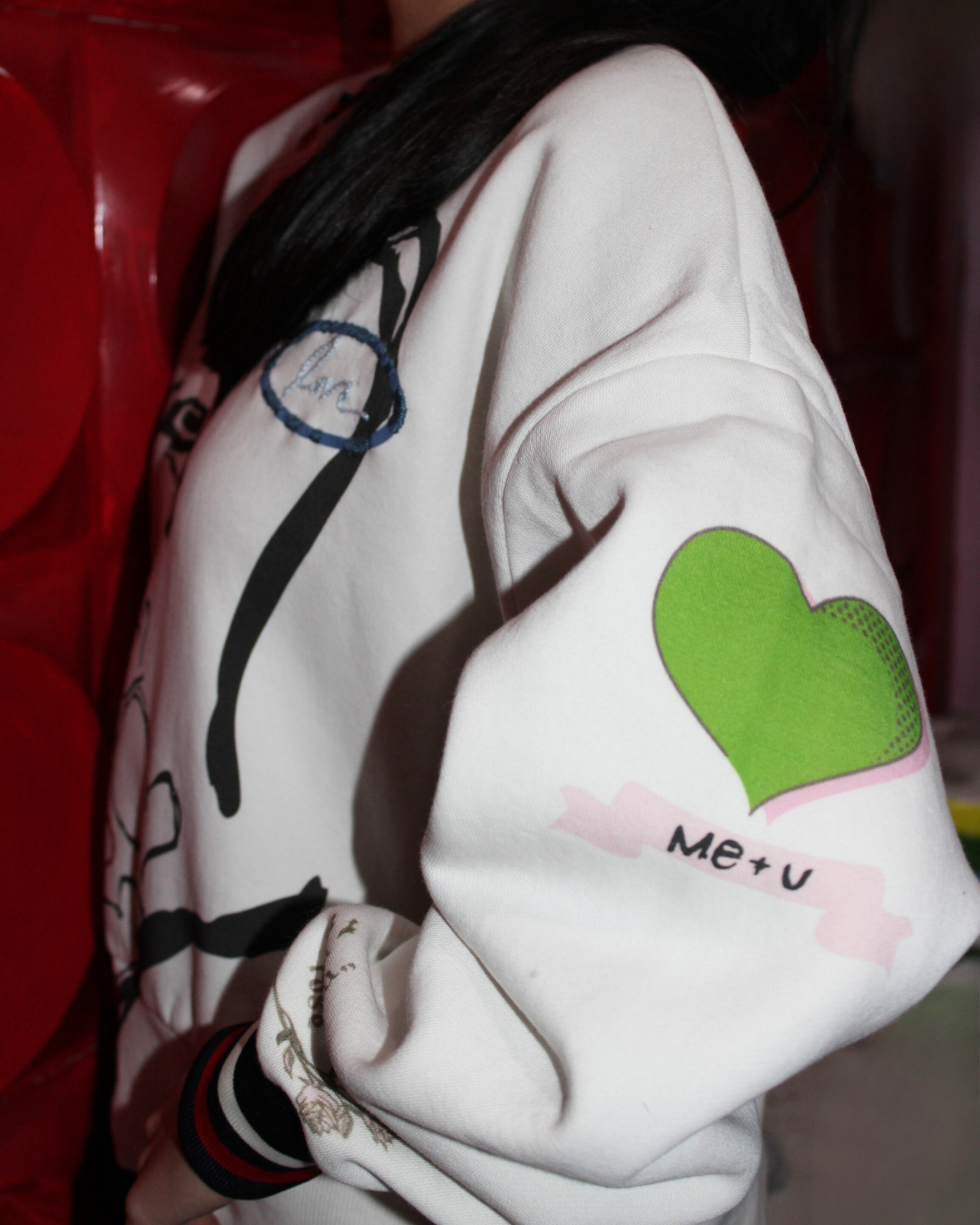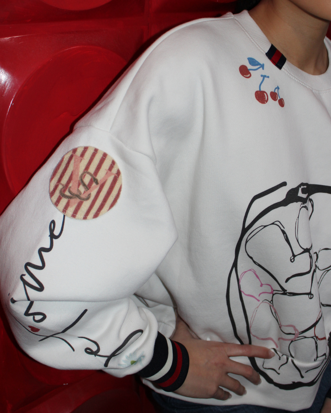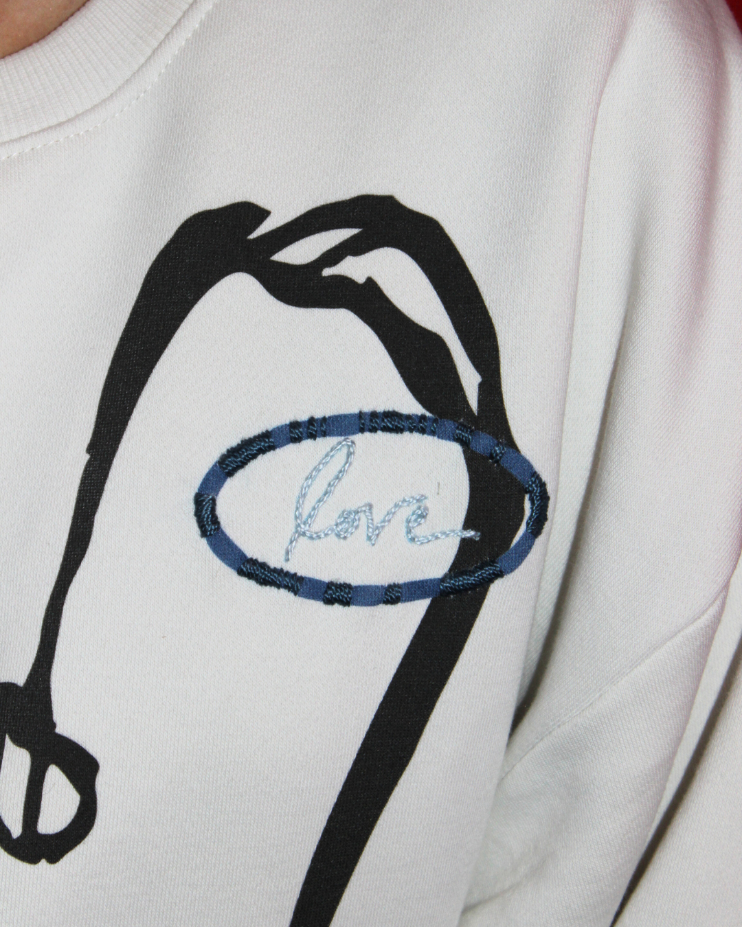 this pullover is a love bomb in sweatshirt form, with hearts, cherries, cupid, and patches stitched throughout. finished with hand-embroidered details and navy cuffs, it’s playful, nostalgic, and made to wear on repeat.