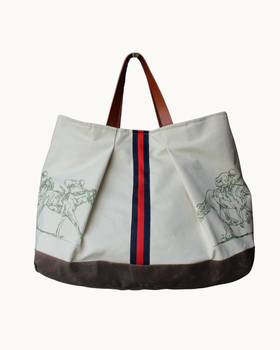 the hardy stock tote is made with our classic canvas, printed with our signature running horses print to add equestrian flavor. for additional flair, this bag is outfitted with our iconic navy/red ribbon, brown leather handles, and brown waxed canvas trim. this guy is perfect as an everyday tote or for toting your necessities for a great weekend!