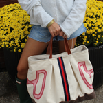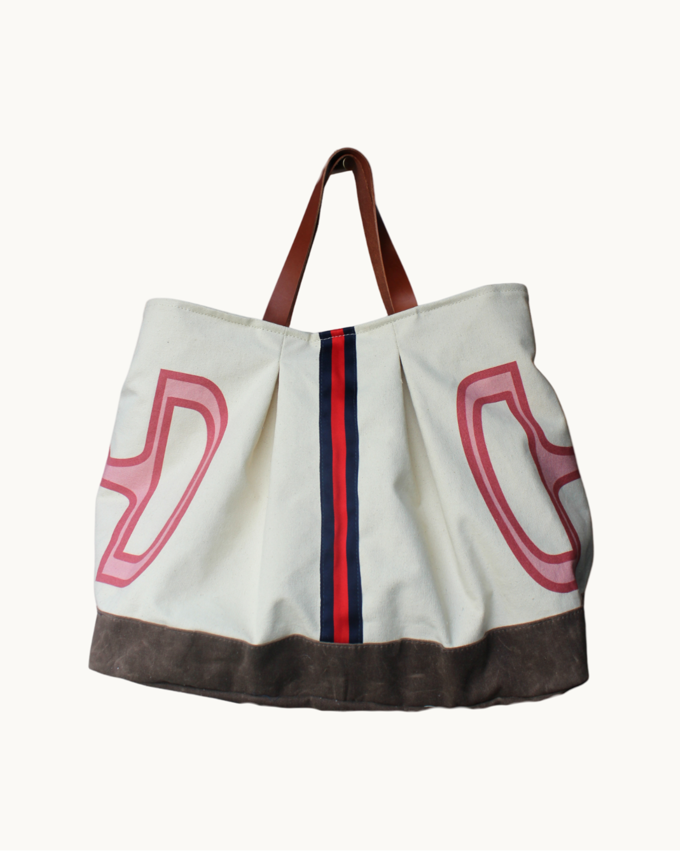 the hardy stock tote is made with our classic canvas, printed with smokey rose bits to add equestrian flavor. for additional flair, this bag is outfitted with our iconic navy/red ribbon, brown leather handles, and brown waxed canvas trim. this guy is perfect as an everyday tote or for toting your necessities for a great weekend!