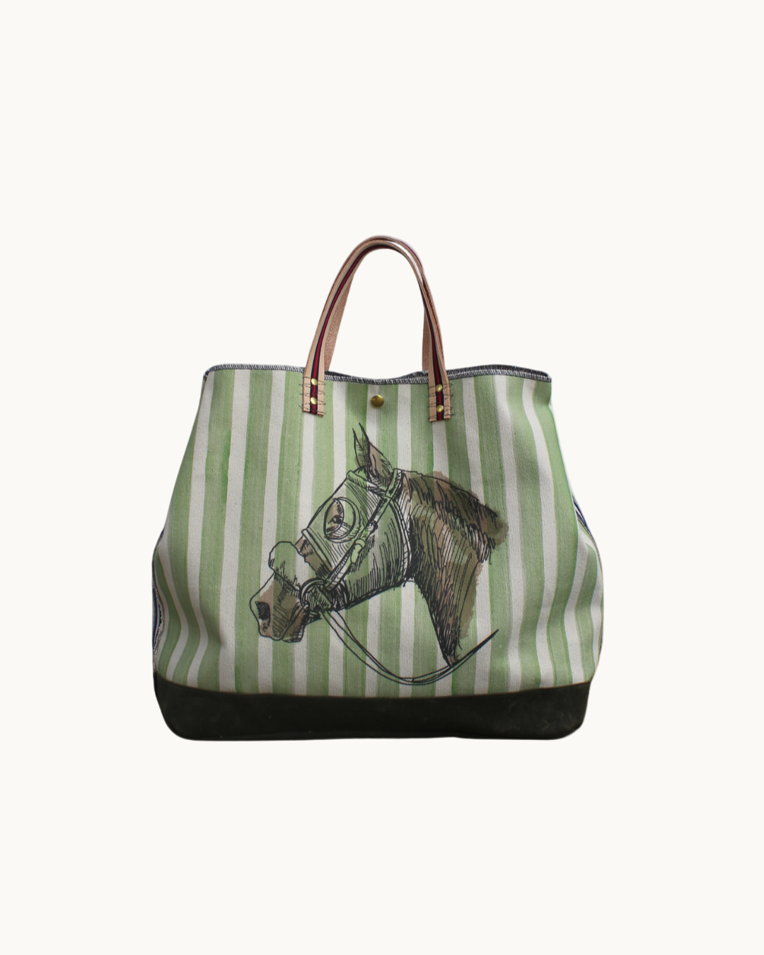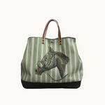 with its equestrian-inspired stripes and horsehead print, the lenny large brings a touch of whimsy to your everyday. a brown waxed bottom adds structure, while sturdy leather handles with our signature ribbon make it easy to grab and go. inside, a roomy interior with a pocket keeps your essentials tucked neatly away—ready for errands, adventures, and everything in between.