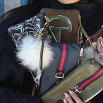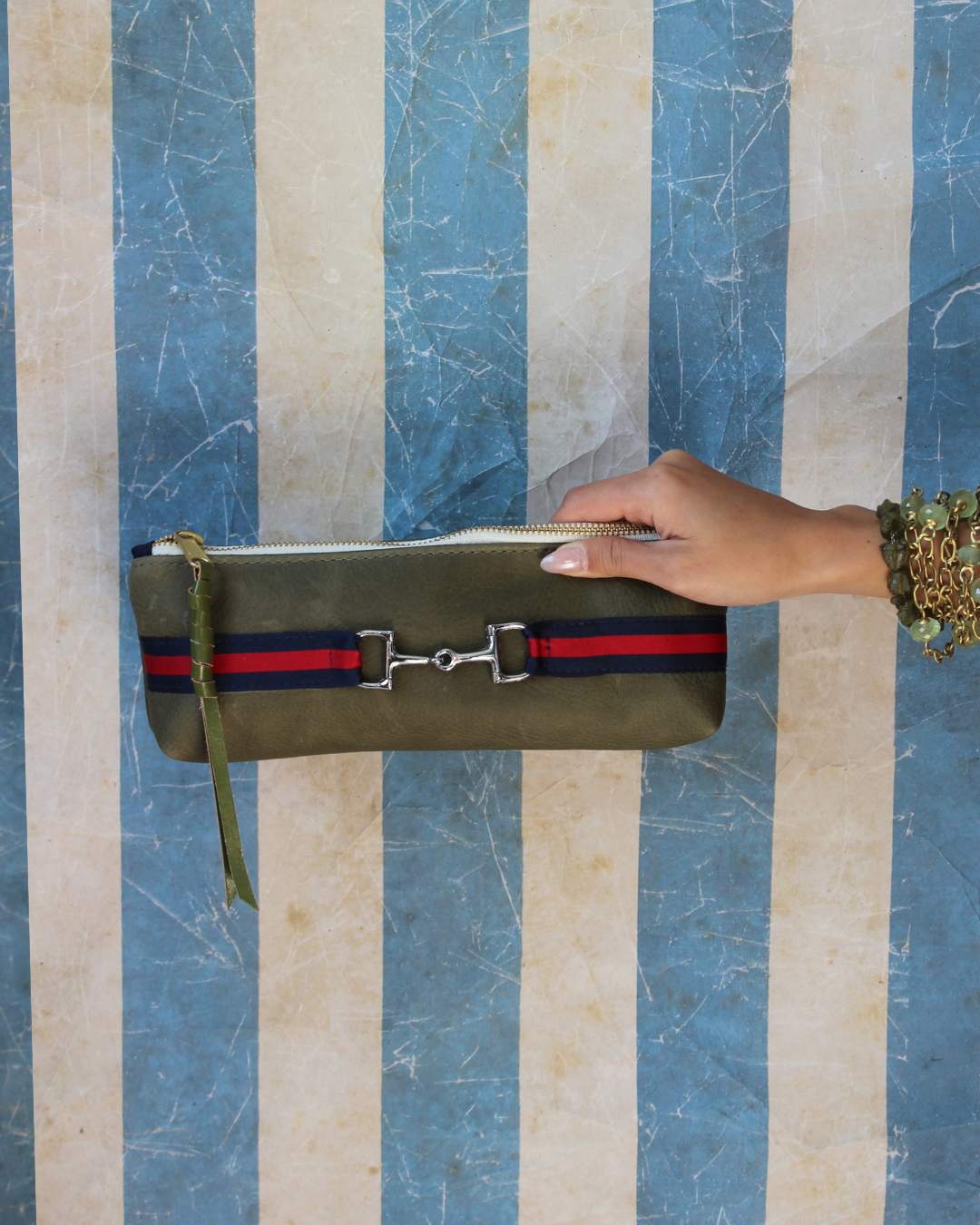 crafted in rich olive leather, this sleek statement piece is elevated with our signature ribbon, horsebit detail, a vintage white fox fur pom, and an olive green leather tassel zipper for just the right touch of chic.