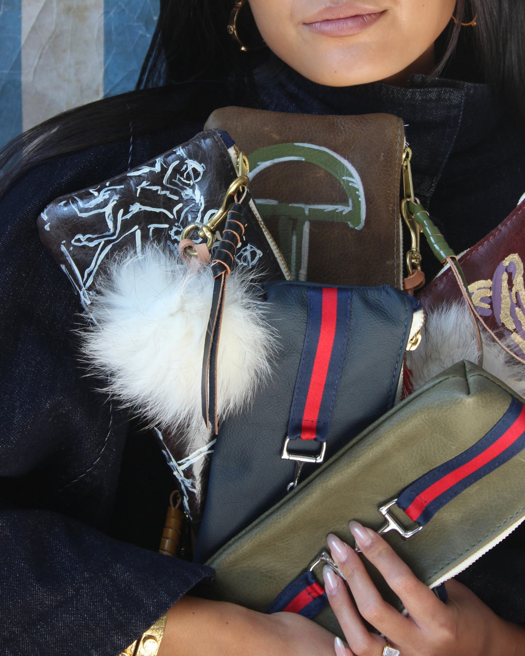 an espresso leather clutch that’s anything but plain — brought to life with a hand-painted horsebit by our muse @katlynannart. finished with a vintage white fox fur pom and an olive green leather tassel zipper for just the right touch of chic.