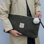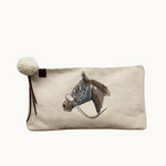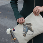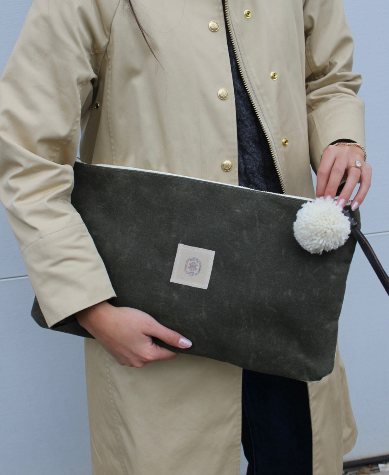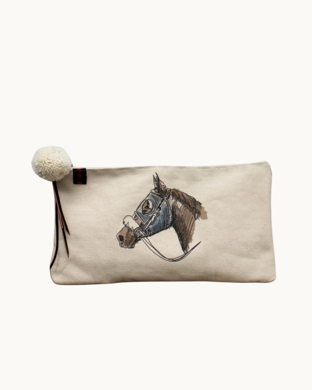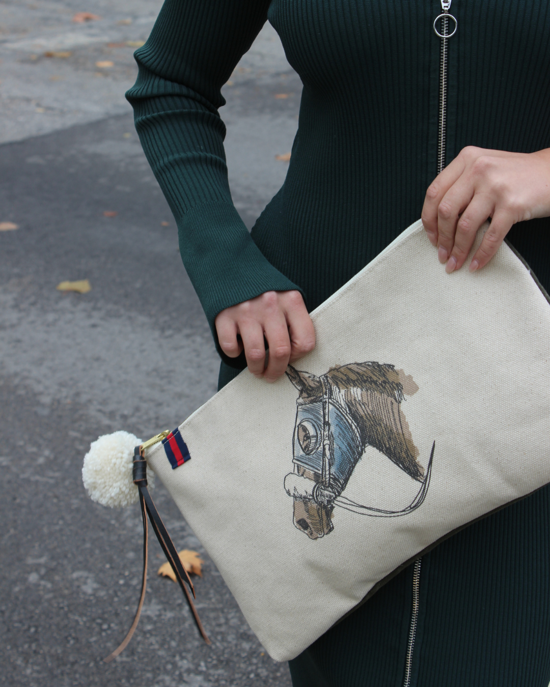 a clutch that does the most by doing the least. the renner combines our signature horsehead print with an olive green waxed back, striped lining, and leather + pom zipper tie. oversized, effortless, and ready to turn heads.