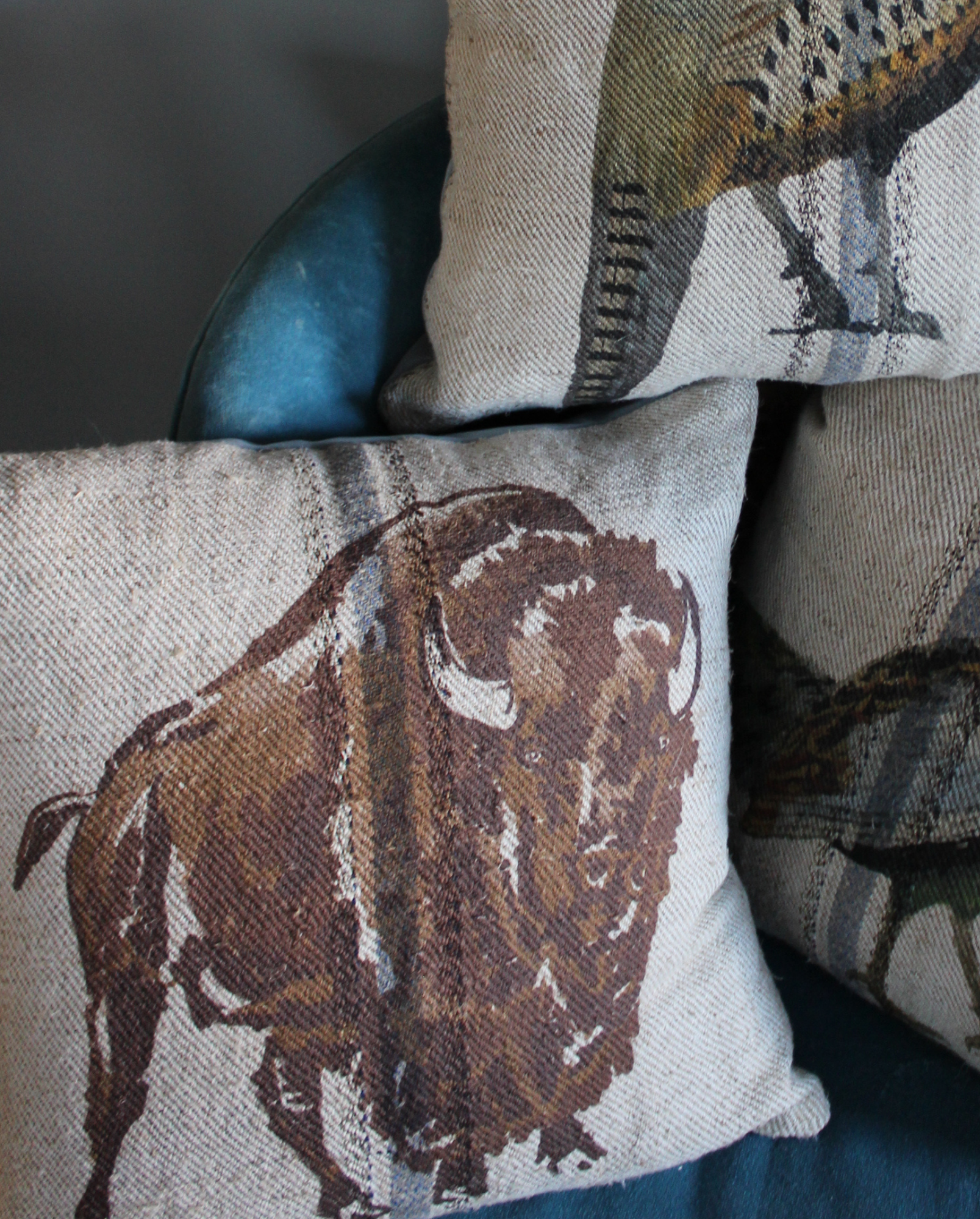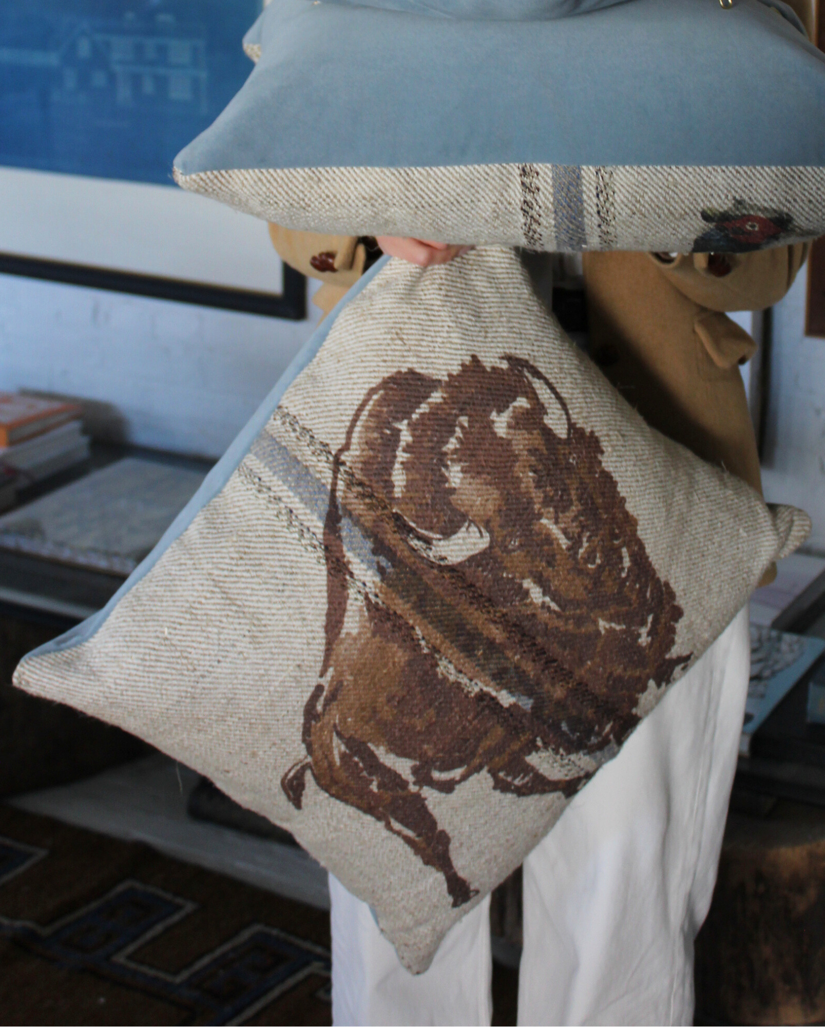 our signature buffalo print meets rustic french linen grain sack and a rich blue velvet back. finished with a plush faux-down insert for a soft, refined touch.