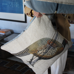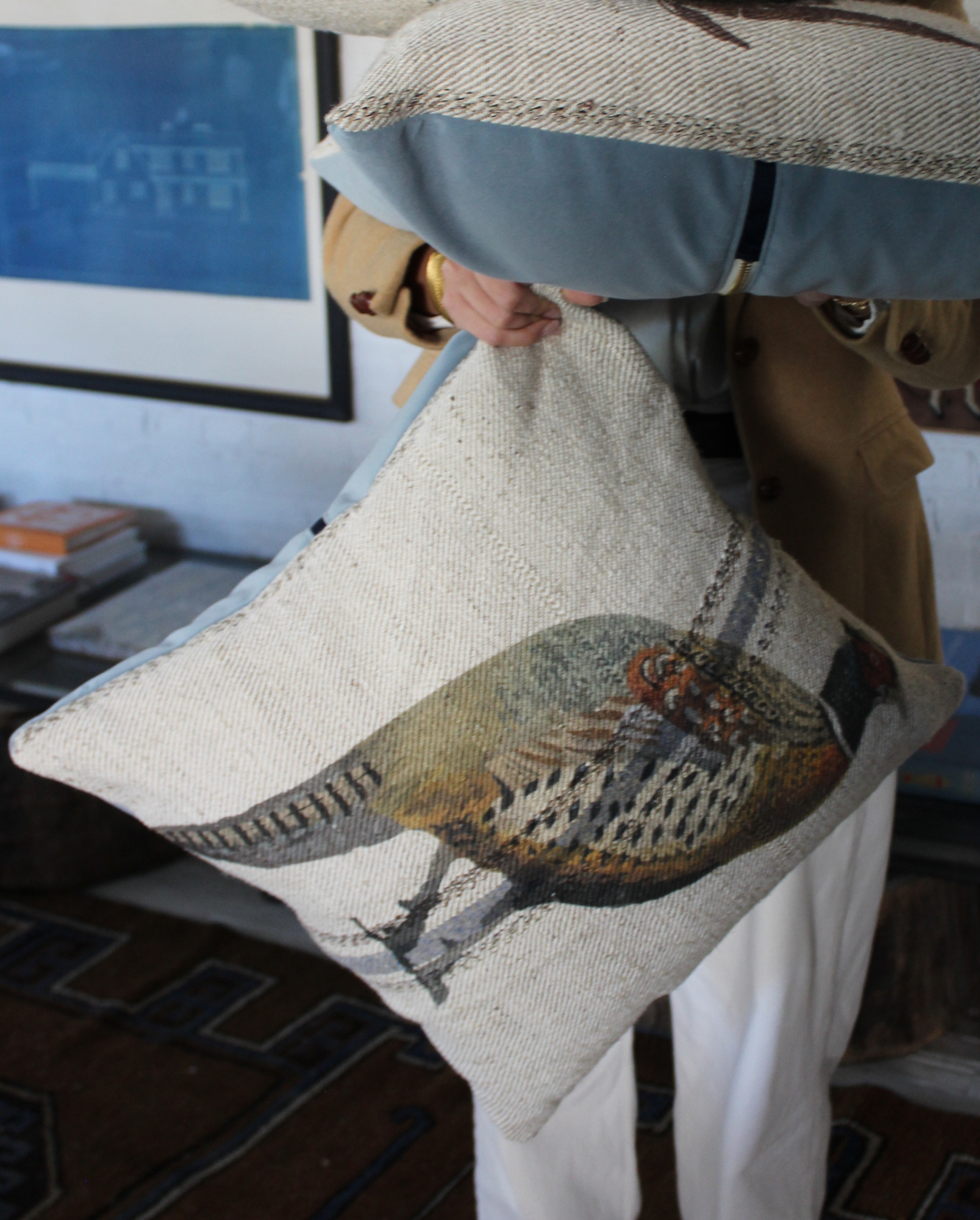 our signature pheasant print meets rustic french linen grain sack and a rich blue velvet back. finished with a plush faux-down insert for a soft, refined touch.