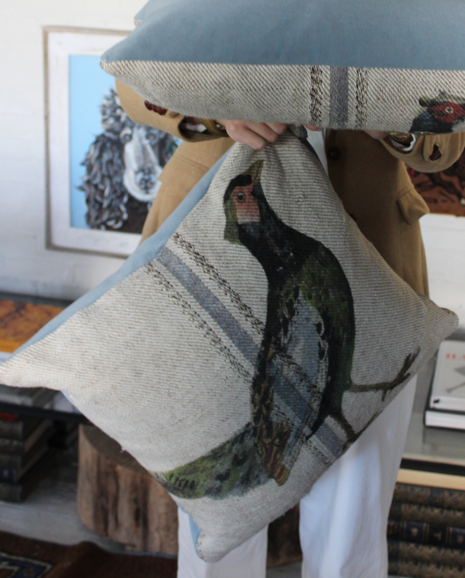 our signature pheasant print meets rustic french linen grain sack and a rich blue velvet back. finished with a plush faux-down insert for a soft, refined touch.