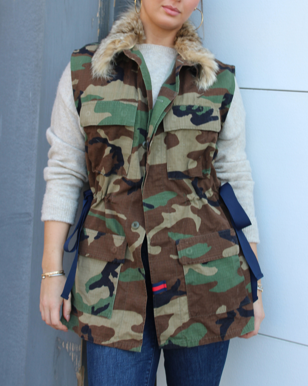 a seasonless staple, our go-to layer, everything you need, and more, in a one-of-a-kind silhouette. this style is made from a vintage army jacket and made better with a detachable fur collar, cinch waist, and tie sides.