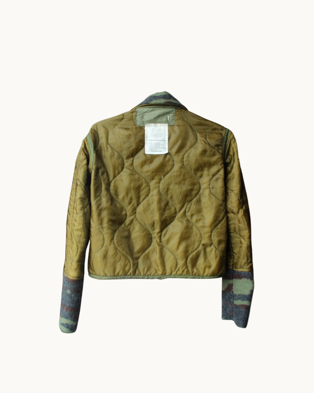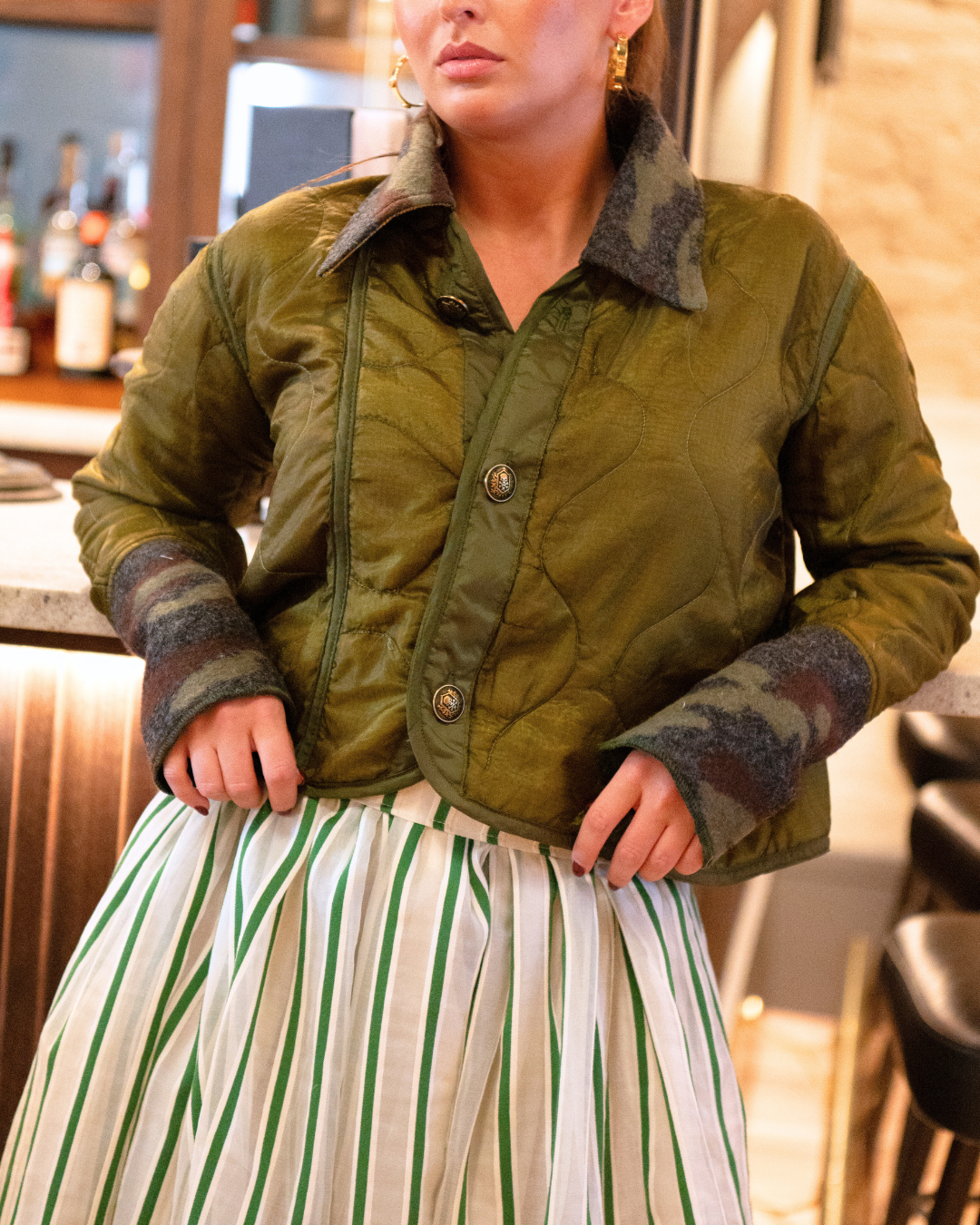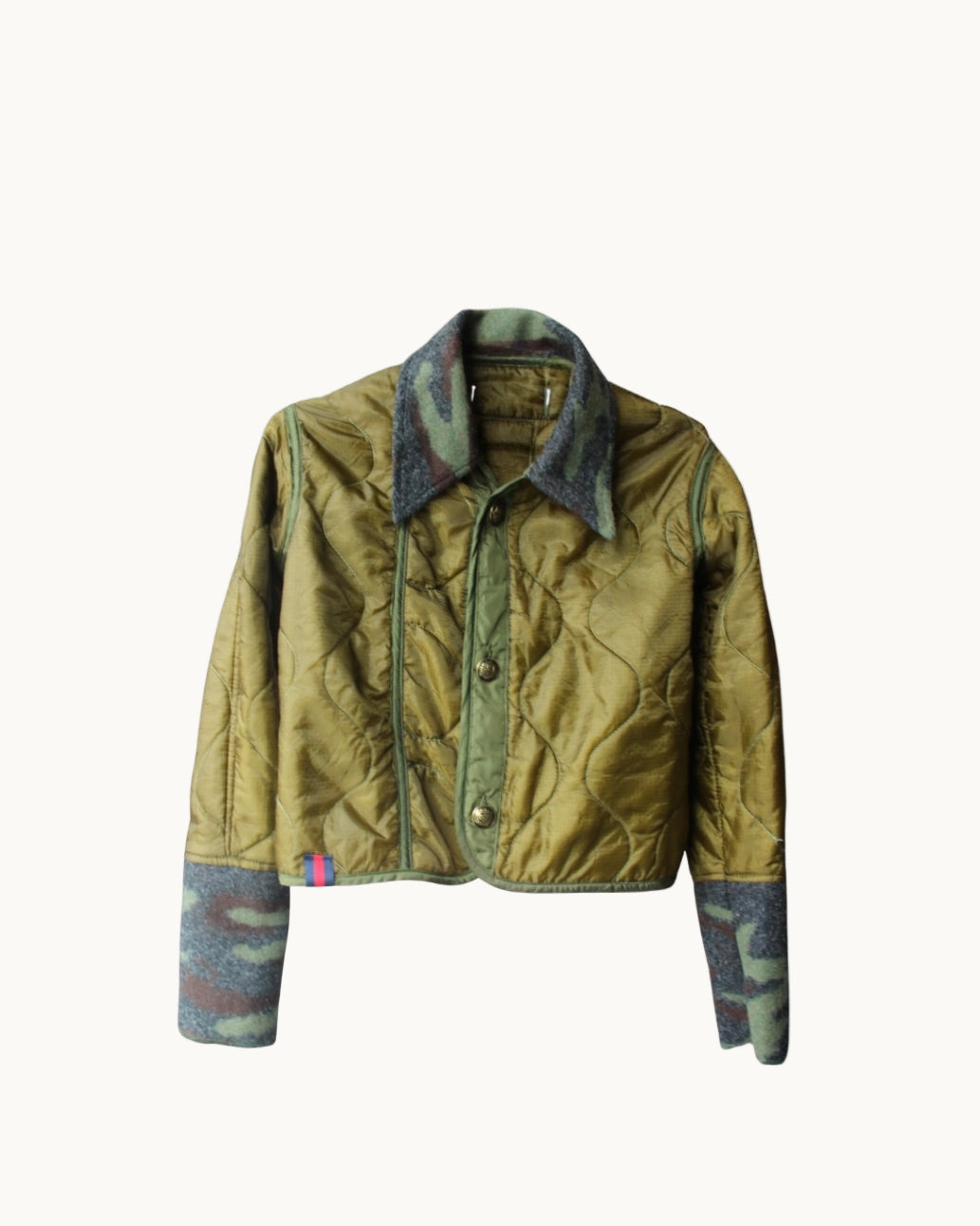 a seasonless staple, our go-to layer, everything you need, and more, in a one-of-a-kind silhouette. this style is made from a vintage military jacket and made better with a cropped hem, wool camo collar, camo sleaves, and brass buttons. your closet will thank you...