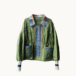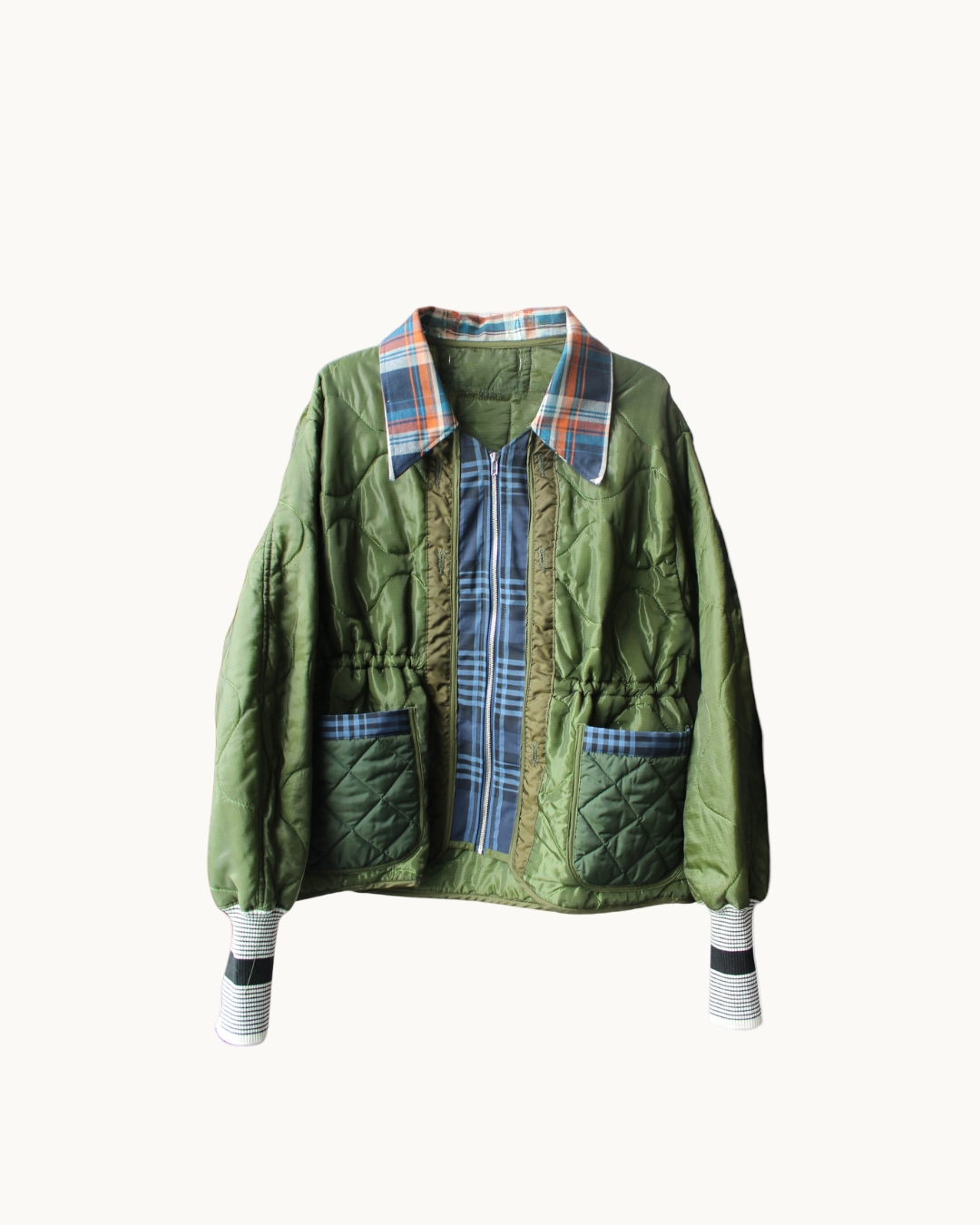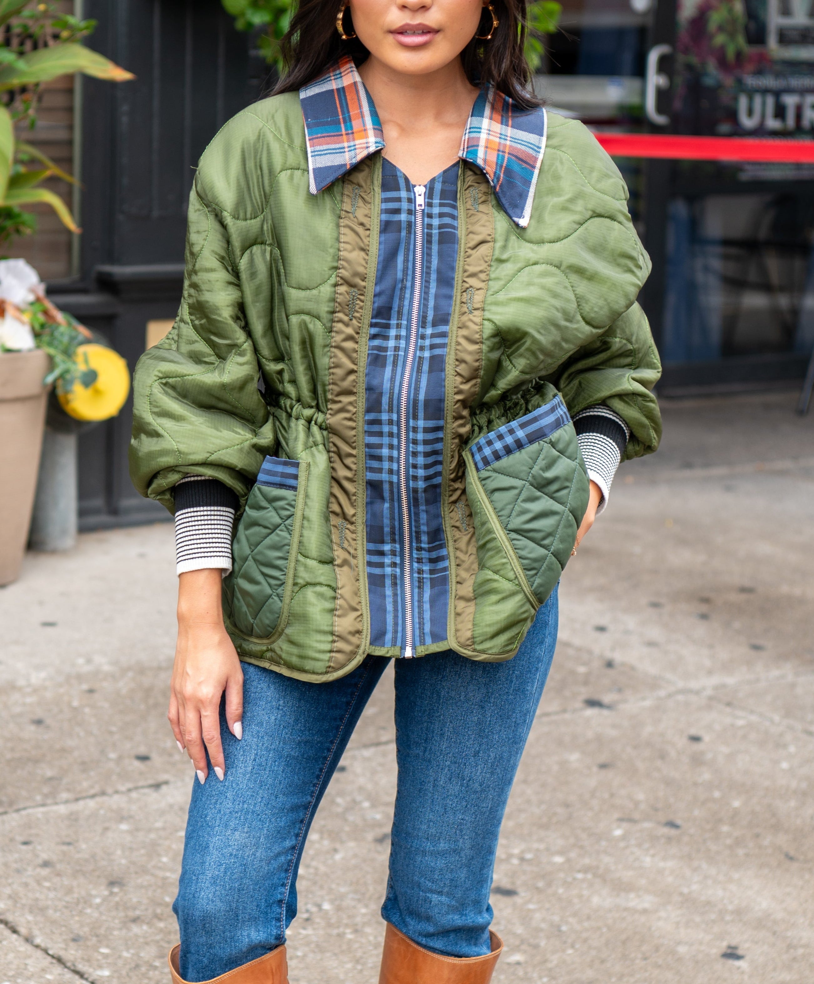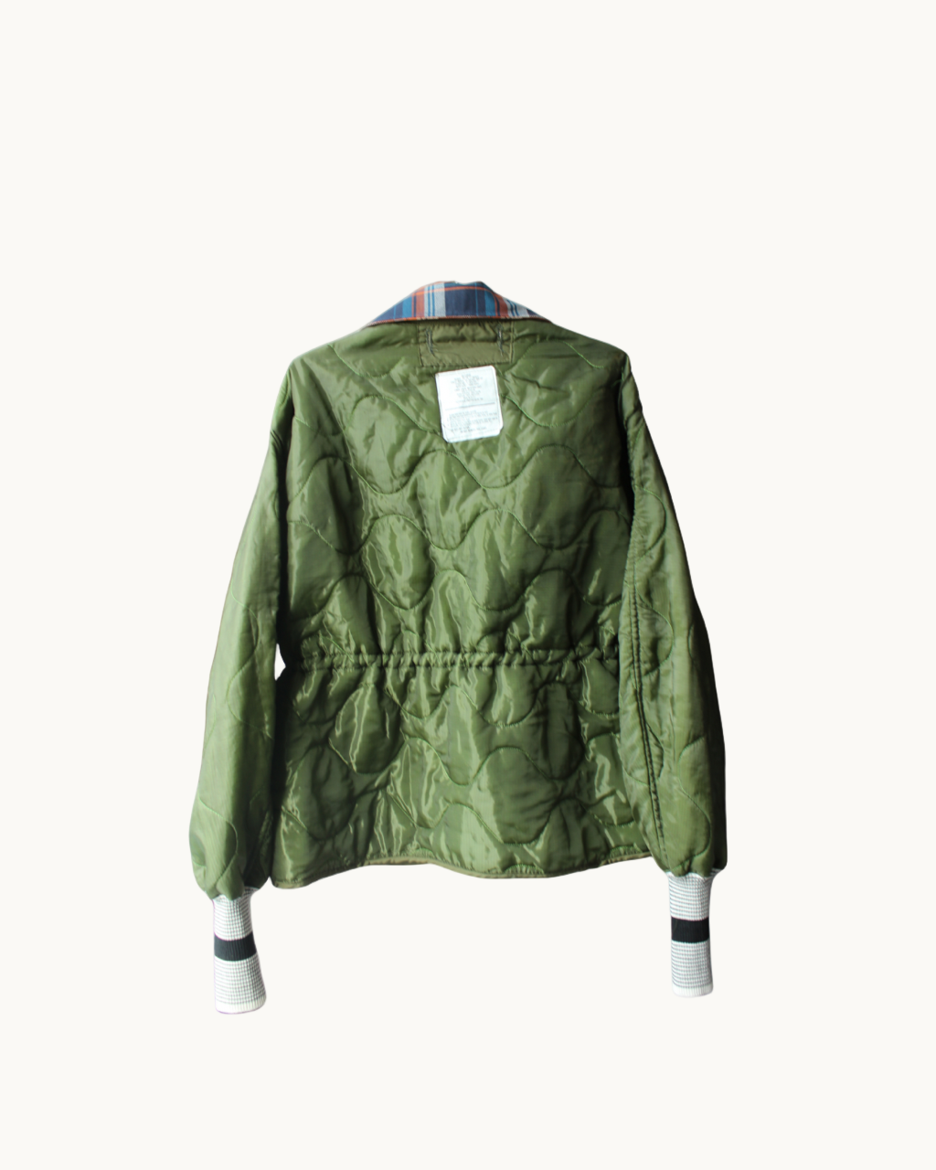 a seasonless staple, our go-to layer, everything you need, and more, in a one-of-a-kind silhouette. this style is made from a vintage military jacket and made better with a cinch waist, plaid collar, black and white stripe cuff, and a plaid zipper. your closet will thank you...