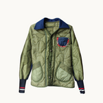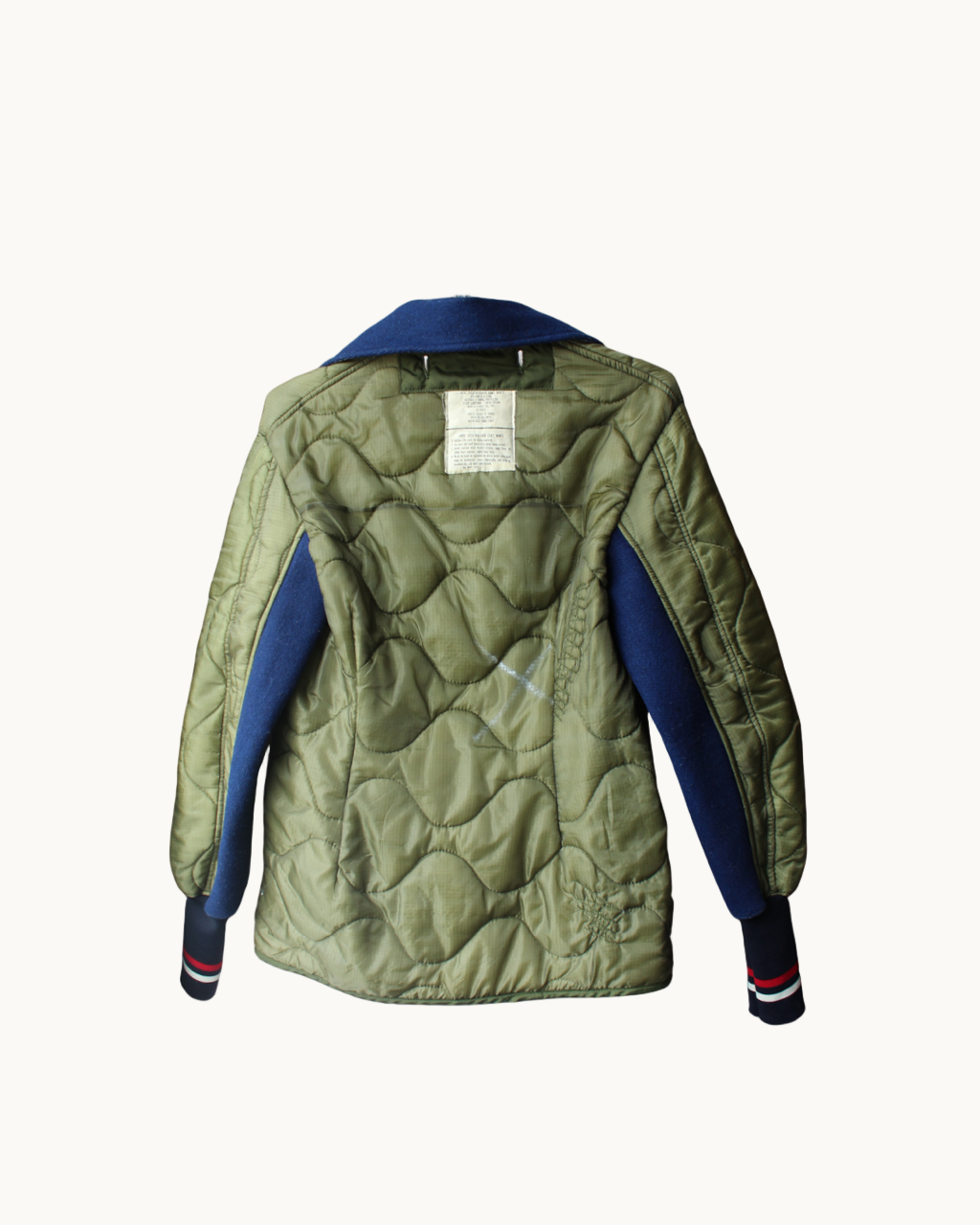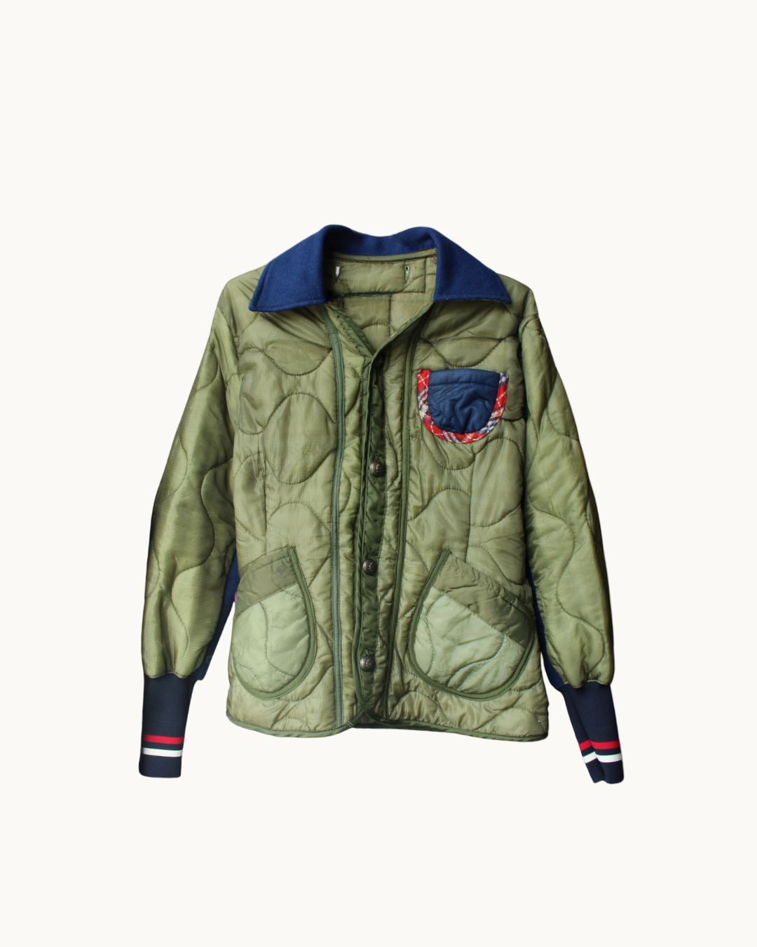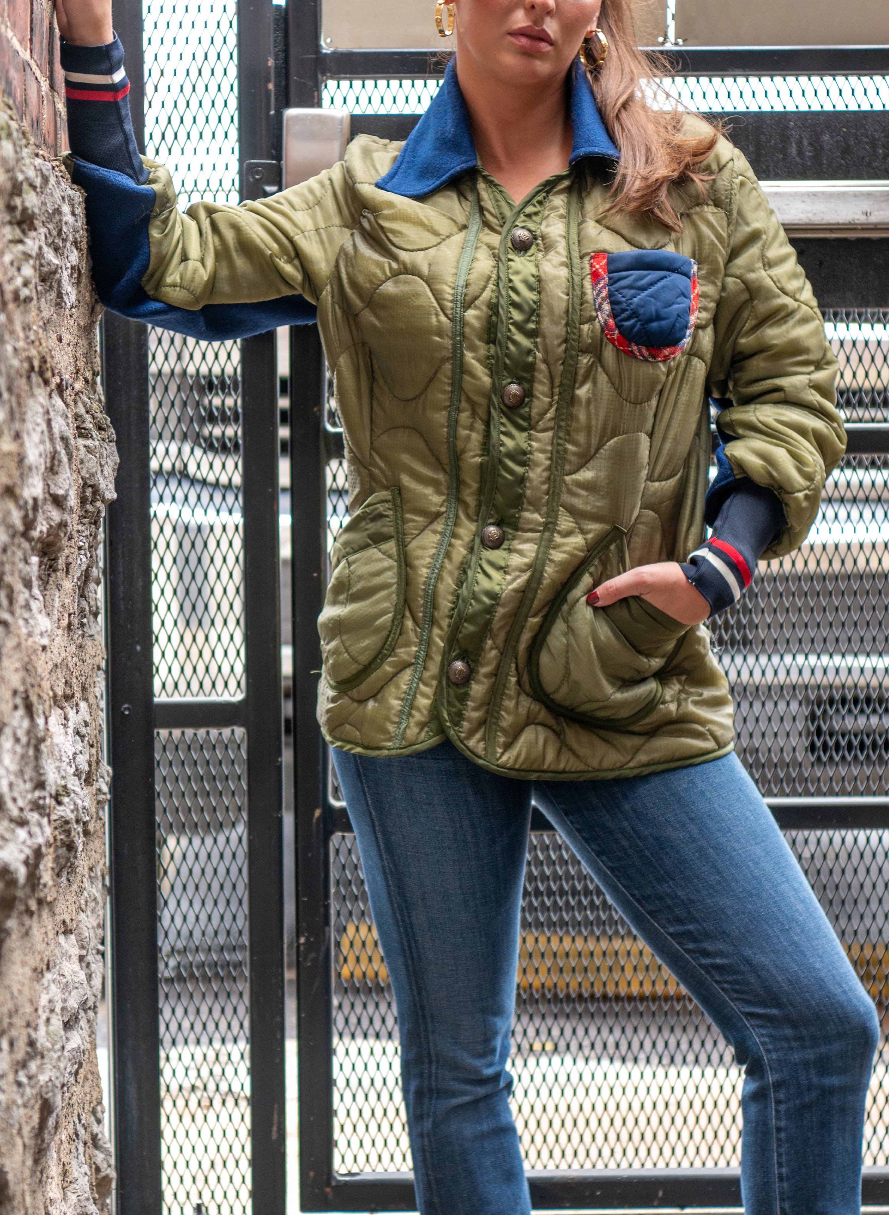 a seasonless staple, our go-to layer, everything you need, and more, in a one-of-a-kind silhouette. this style is made from a vintage military jacket. details include a cinched waist, wool sleaves, wrist tab, and brass buttons. your closet will thank you...