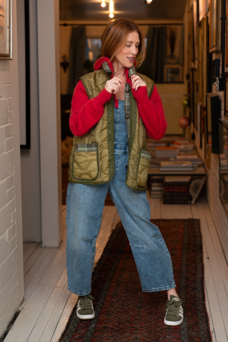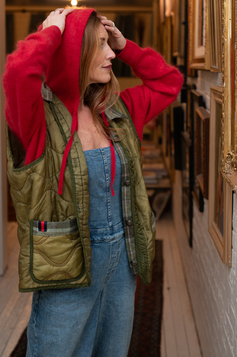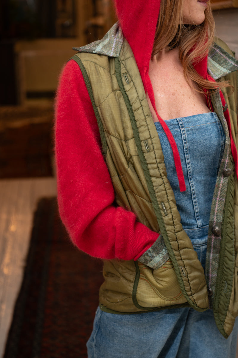 a seasonless staple, our go-to layer, everything you need, and more, in a one-of-a-kind silhouette. this style is made from a vintage military jacket and made better with a beaver fur collar, cinch waist, mustard plaid wool pockets, orange stitch detailing, and brass buttons. your closet will thank you...