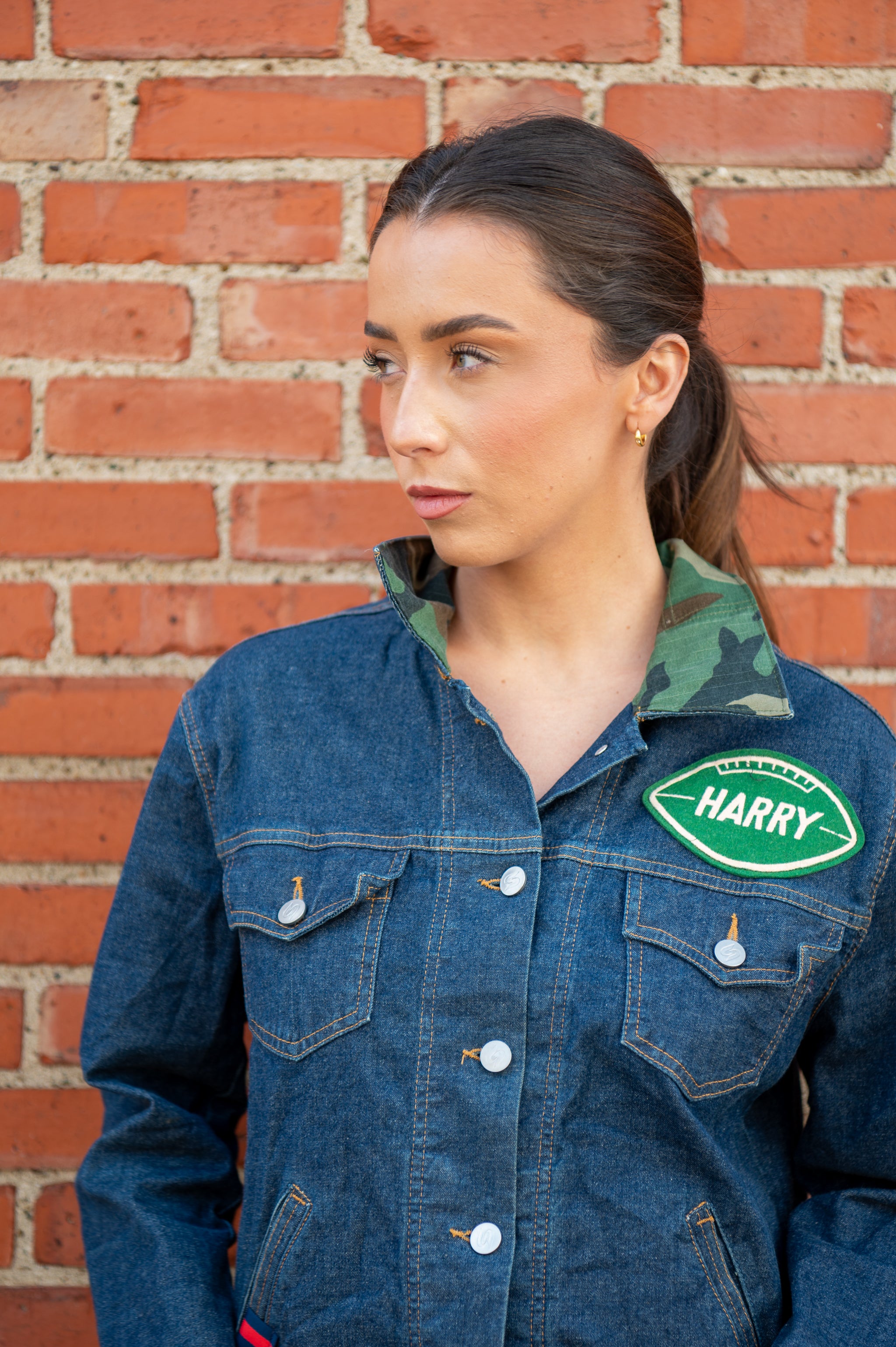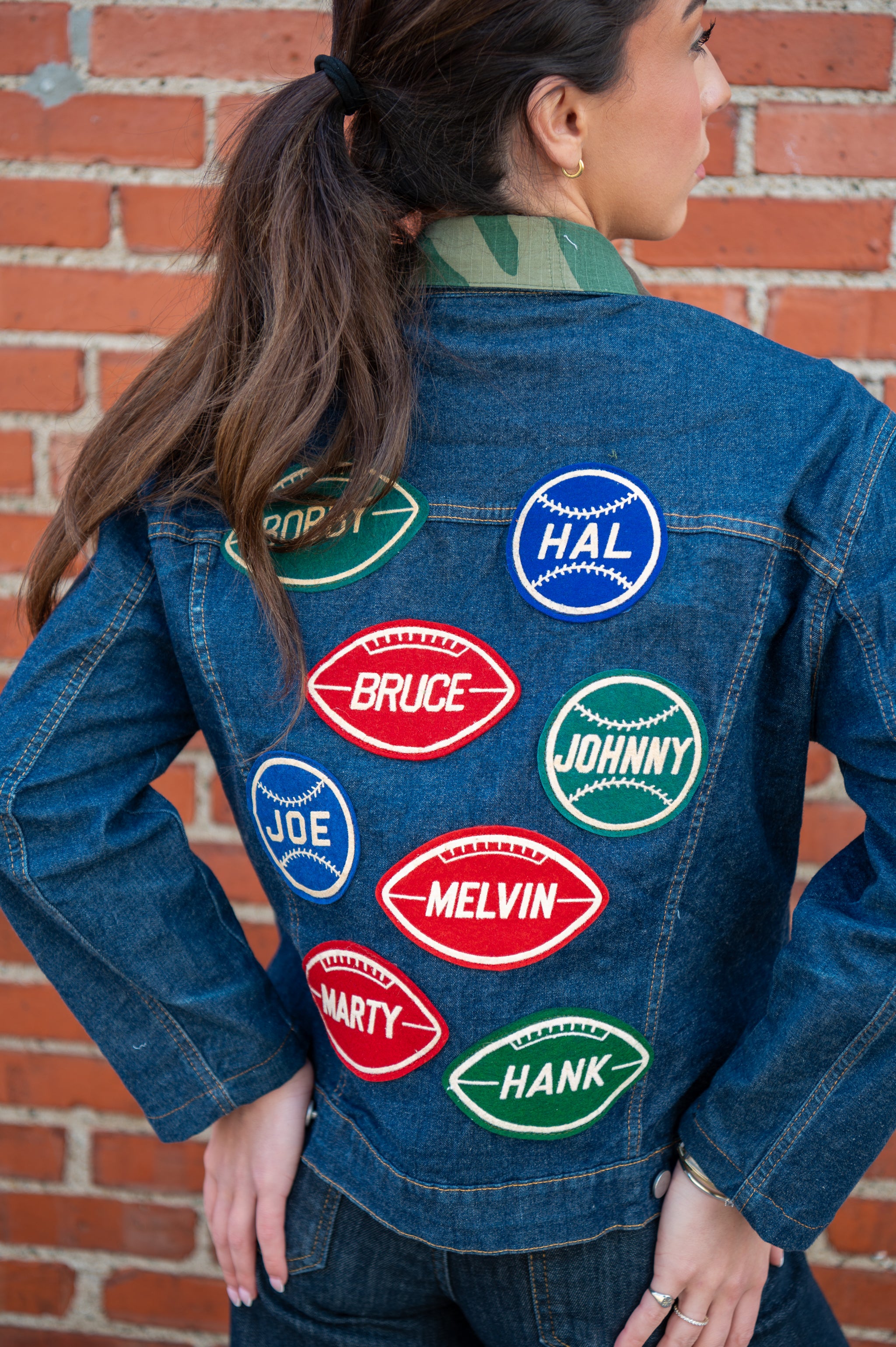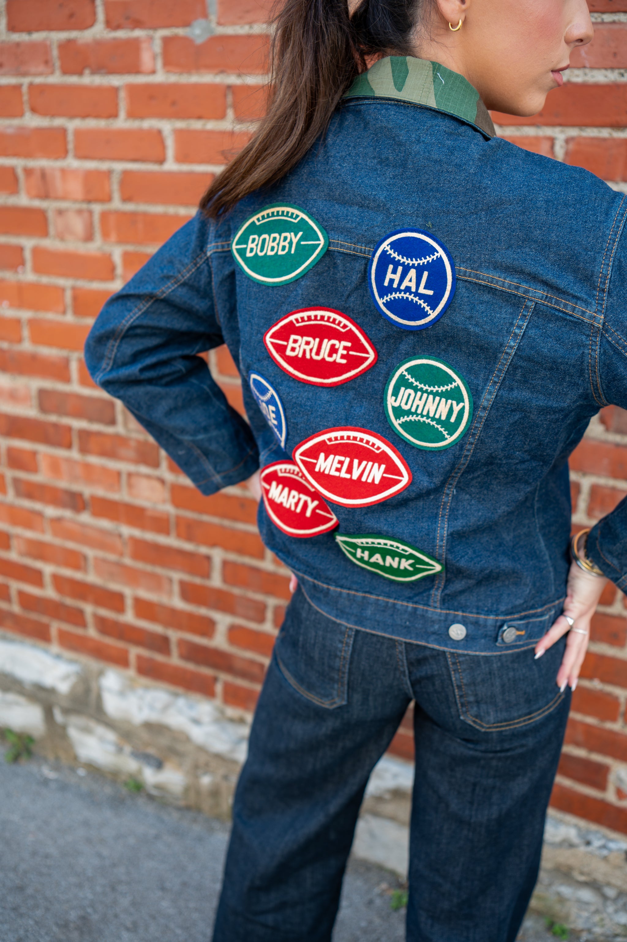 a seasonless staple, our go-to layer, everything you need, and more in a one-of-a-kind silhouette. this style is made from a vintage denim jacket and is elevated with a camo cotton collar, vintage sporty name patches, and our iconic navy/red ribbon. your closet will thank you...