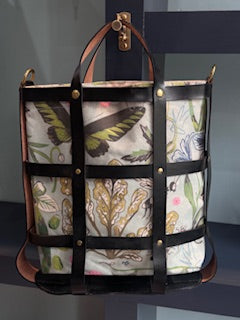 made for a gal about town, the cage tote is a statement piece in an everyday silhouette. tote him to the races or a daring garden party for maximum attraction. this colorway is made of smooth black leather and fashioned with a fleur insert. snaps on the insert will keep it in place, and all your things will be safe inside. say hello to winter in style!