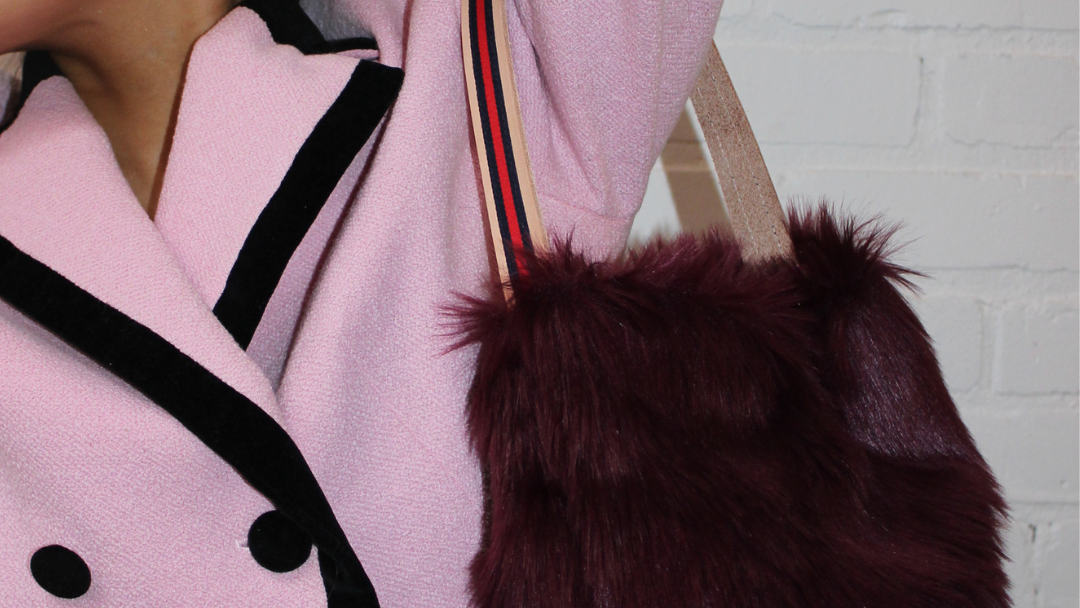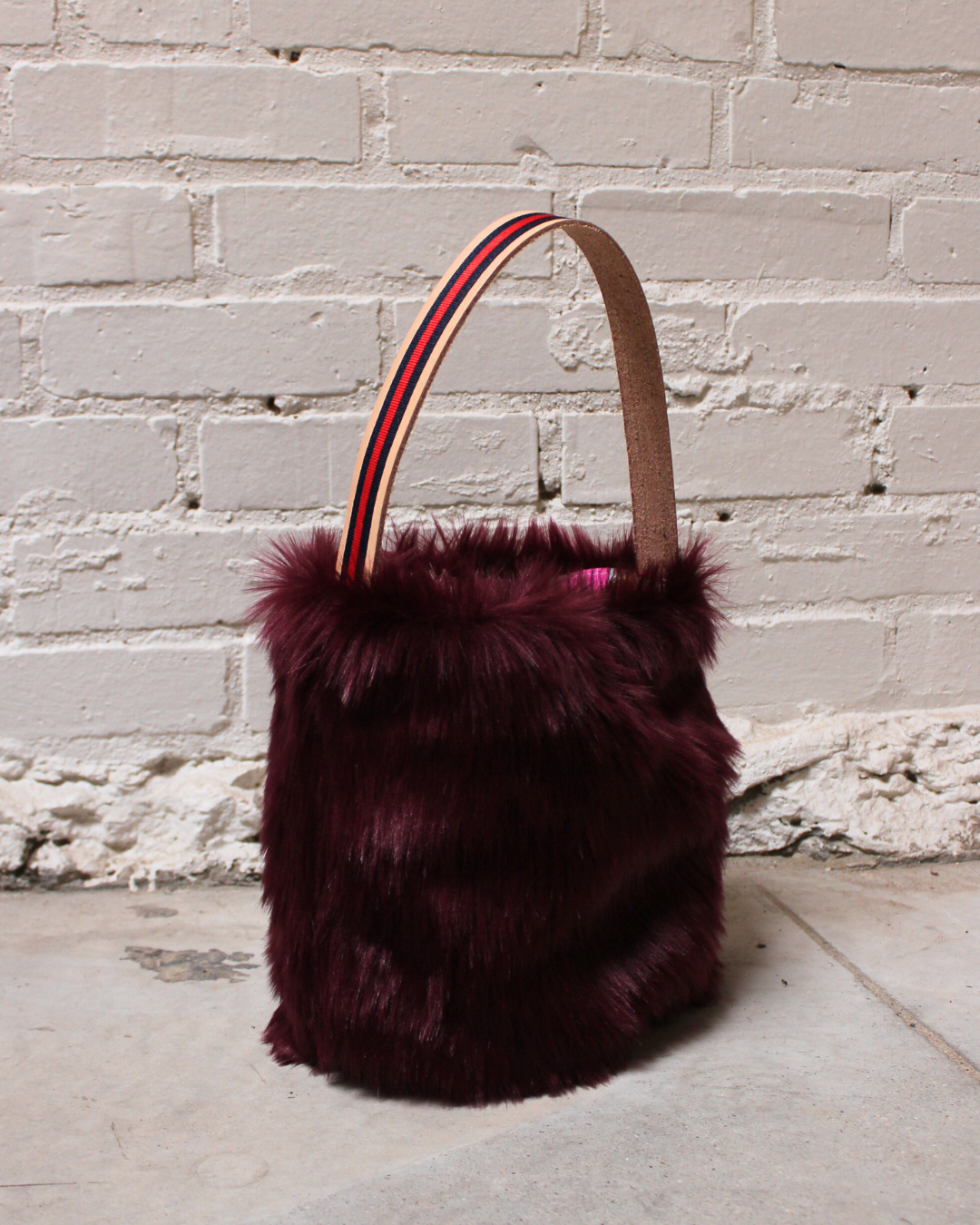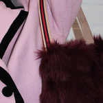 this bucket bag is expertly crafted from faux fur, lined with fabulous fabric, and finished with a leather handle adorned with our signature ribbon. whether you’re heading out for a night on the town or styling it for day, you’re destined to be dazzling.